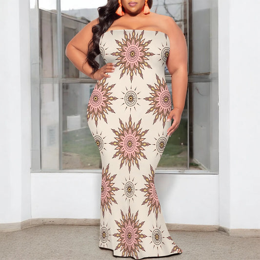 Plus Size Strapless Maxi Dress with Stylish Gold Geometric Design, Modern and Trendy