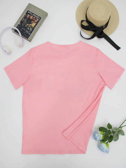 Plus size women's new pink heart-shaped elegant printed T-shirt spring and summer leisure round neck short sleeve top