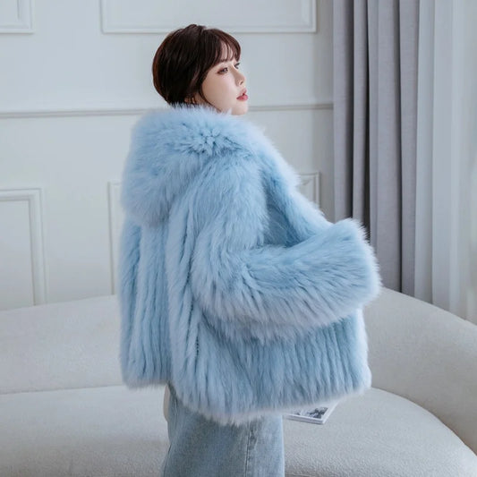 Fox Fur Coat Women's Winter Fashion Warm 100% Fox Fur Coat Hooded Long Sleeved Sweet Women's Luxury Designer Coat