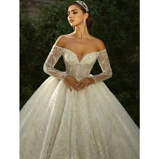Wedding Dresses Ball Gowns Sequins Beading Lace Bridal Dresses Off Shoulder Long Sleeves Train Vestidos De Noiva Customized