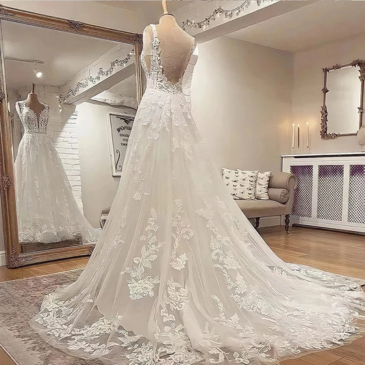 Exquisite Wedding Dress For Bride V-Neck Backless Bride Gown With Lace Applique A-Line Sweep Train Vestidos De Novia 2023 Nuevos