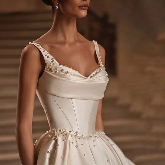 Elegant Ivory Spaghetti Straps With Pearls Wedding Dress Pleated Princess vestidos de novia Customized Satin Ball Gown Plus Size