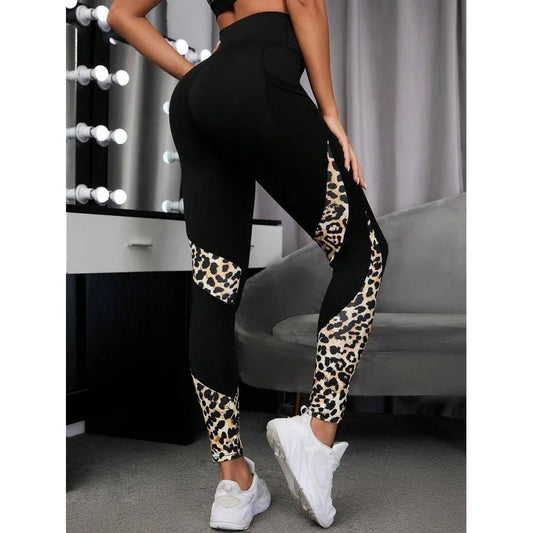 Women Printed Yoga Leggings Leopard Splicing Together Leggings High Waist Butt Lift Fashion Fitness Running with Pocket Legging