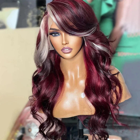 Highlight Burgundy/Blonde Color Body Wave Transparent Color Lace Front Closure Wig Brazilian Virgin Human Hair Wig for Women