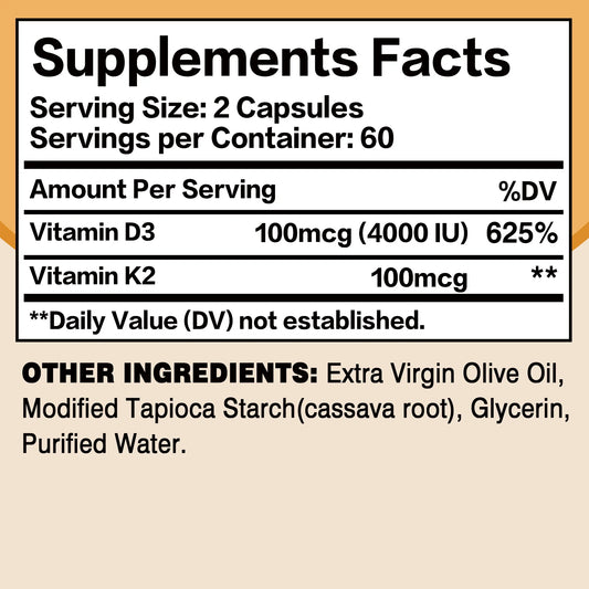 Vitamin D3 + K2 - Promote Calcium Absorption for Strong Bone, Joint, Skin, Immune, Vision and Heart Health - 120 Capsules