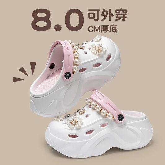 Summer Fashion Pearl Chain DIY Clogs Women 2025 Chunky Platform Slip On Sandals Women Thick Bottom EVA Slippers Shoes Woman Heel