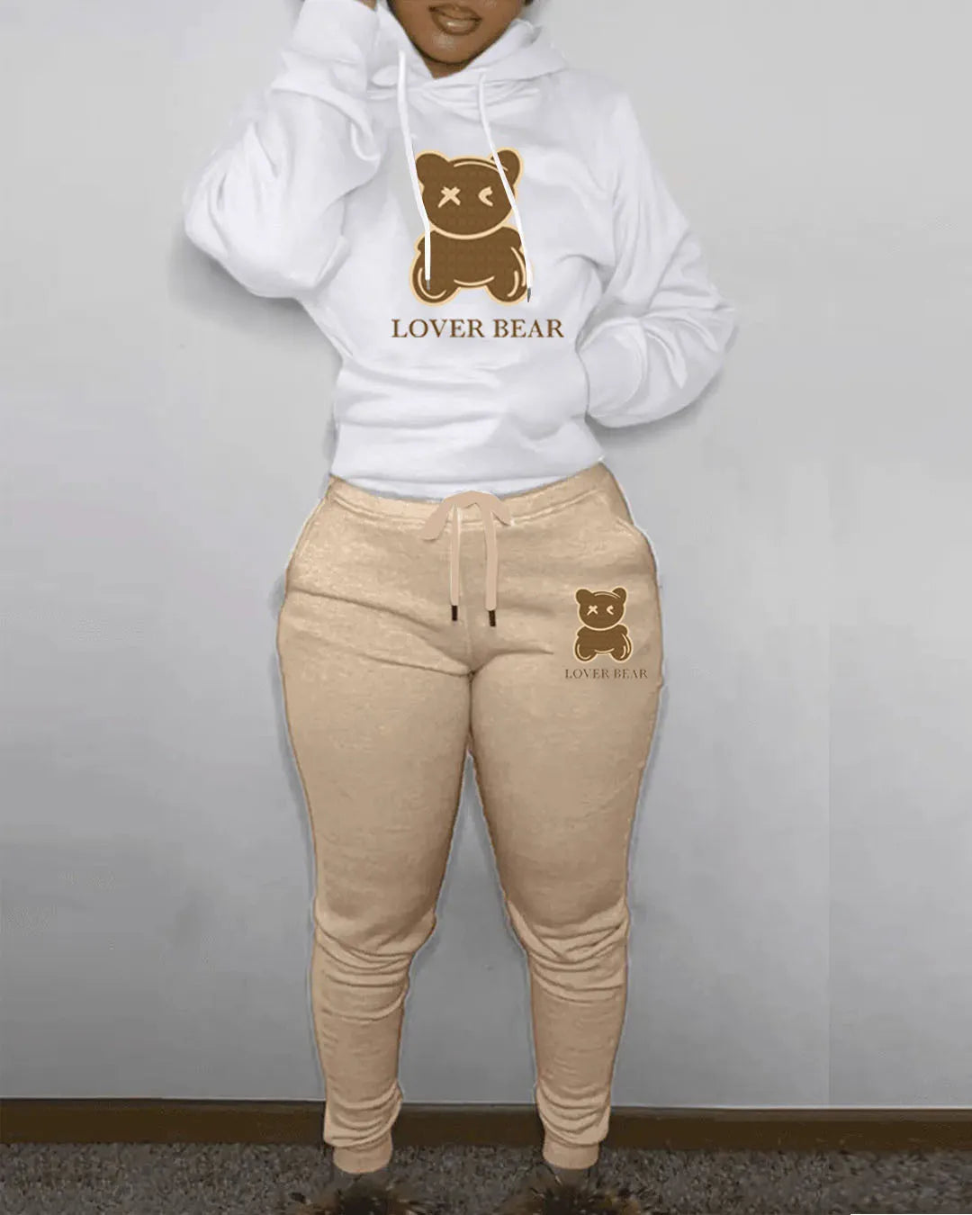 2 Piece Set Women Outfit Letter Bear Print Hooded Neck Hoodies Sweatshirt Pants Tracksuit 2024 Plus Size Streetwear Casual Suit