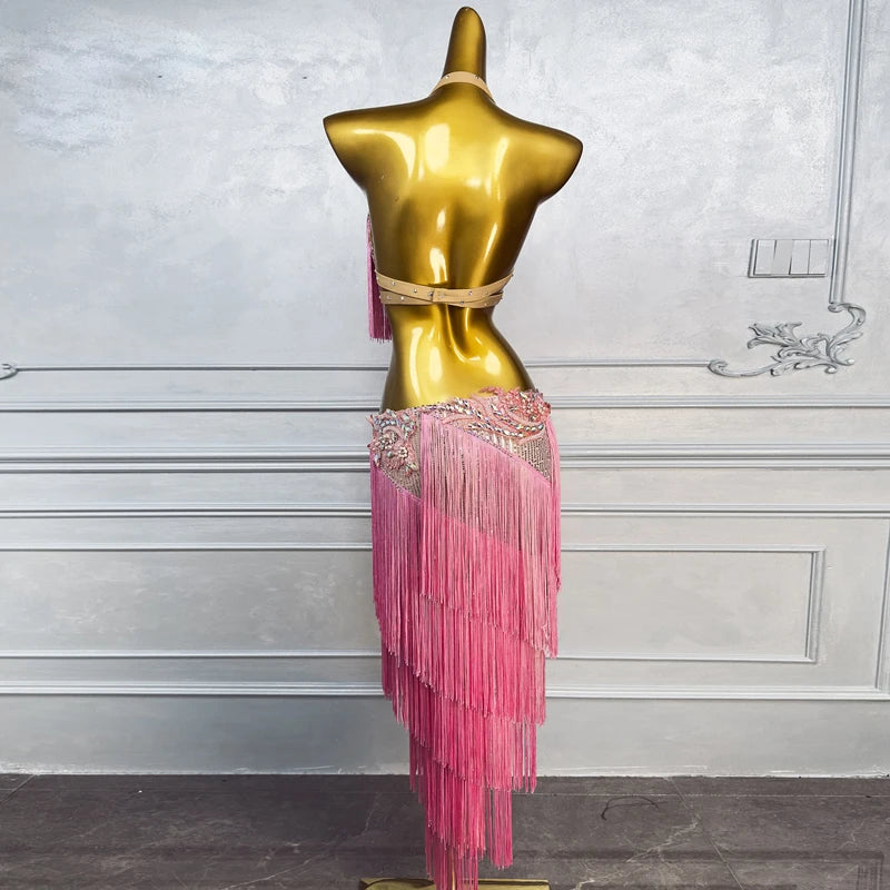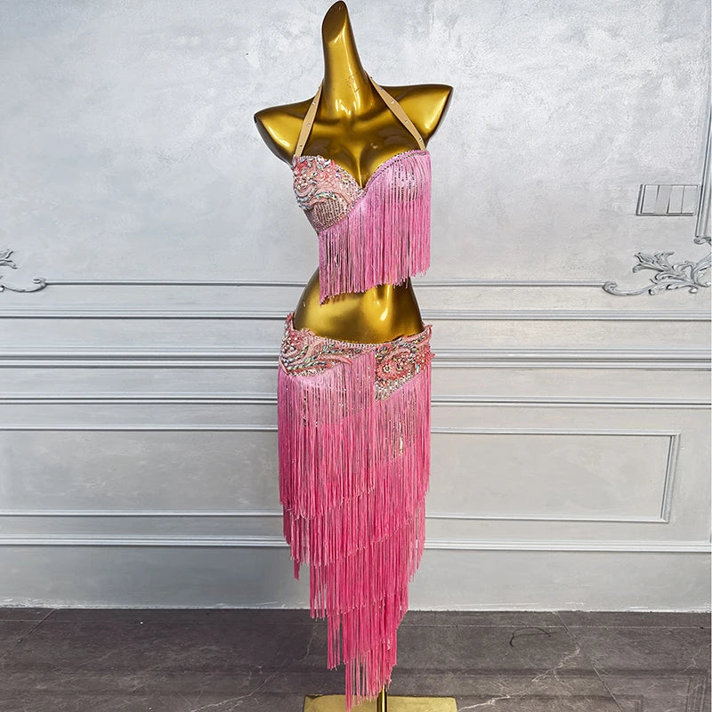Belly Dance Costume Set for Women Pink Sequin Tassel Top+short Skirt 2pcs Performance Costume Custom Drum Solo Short Suit