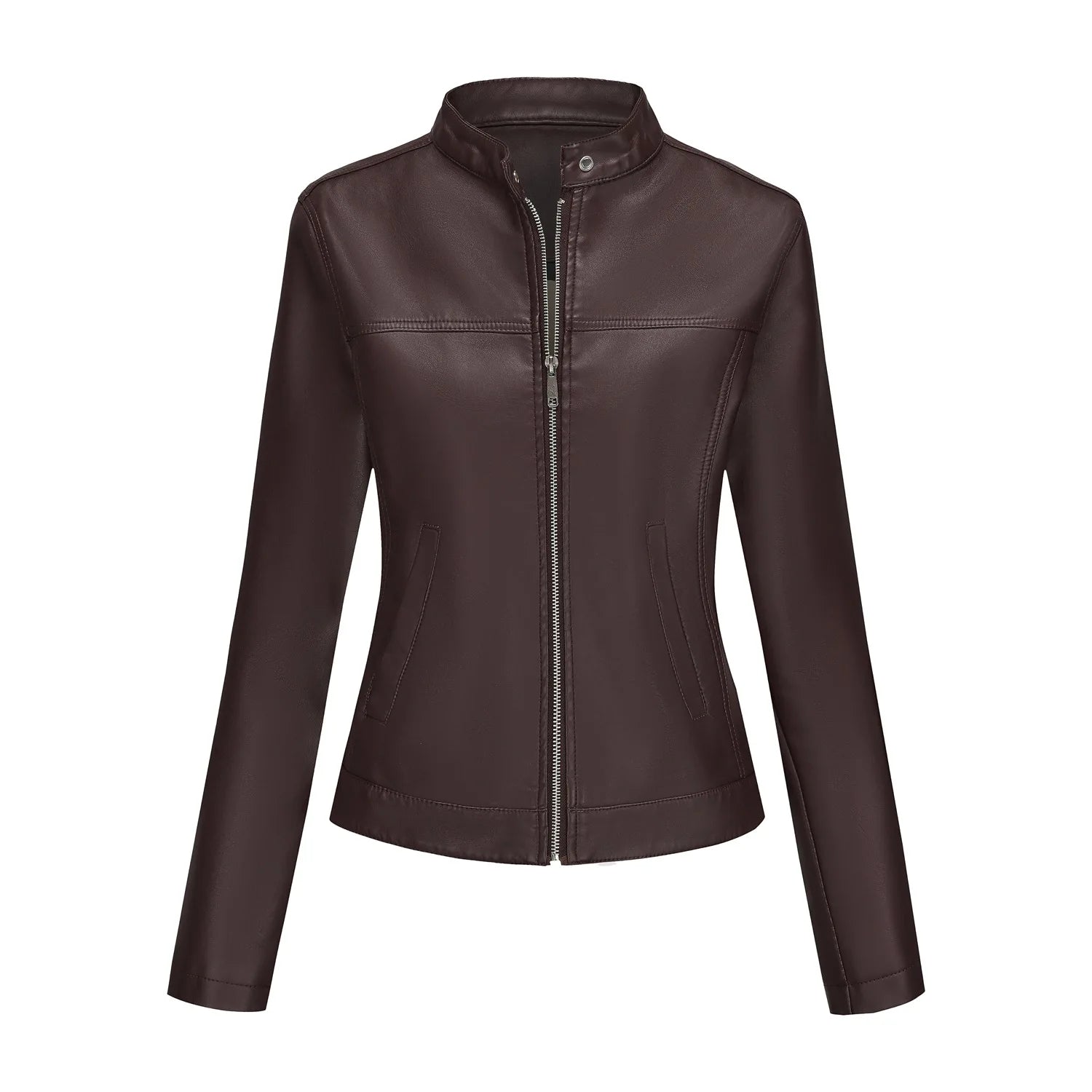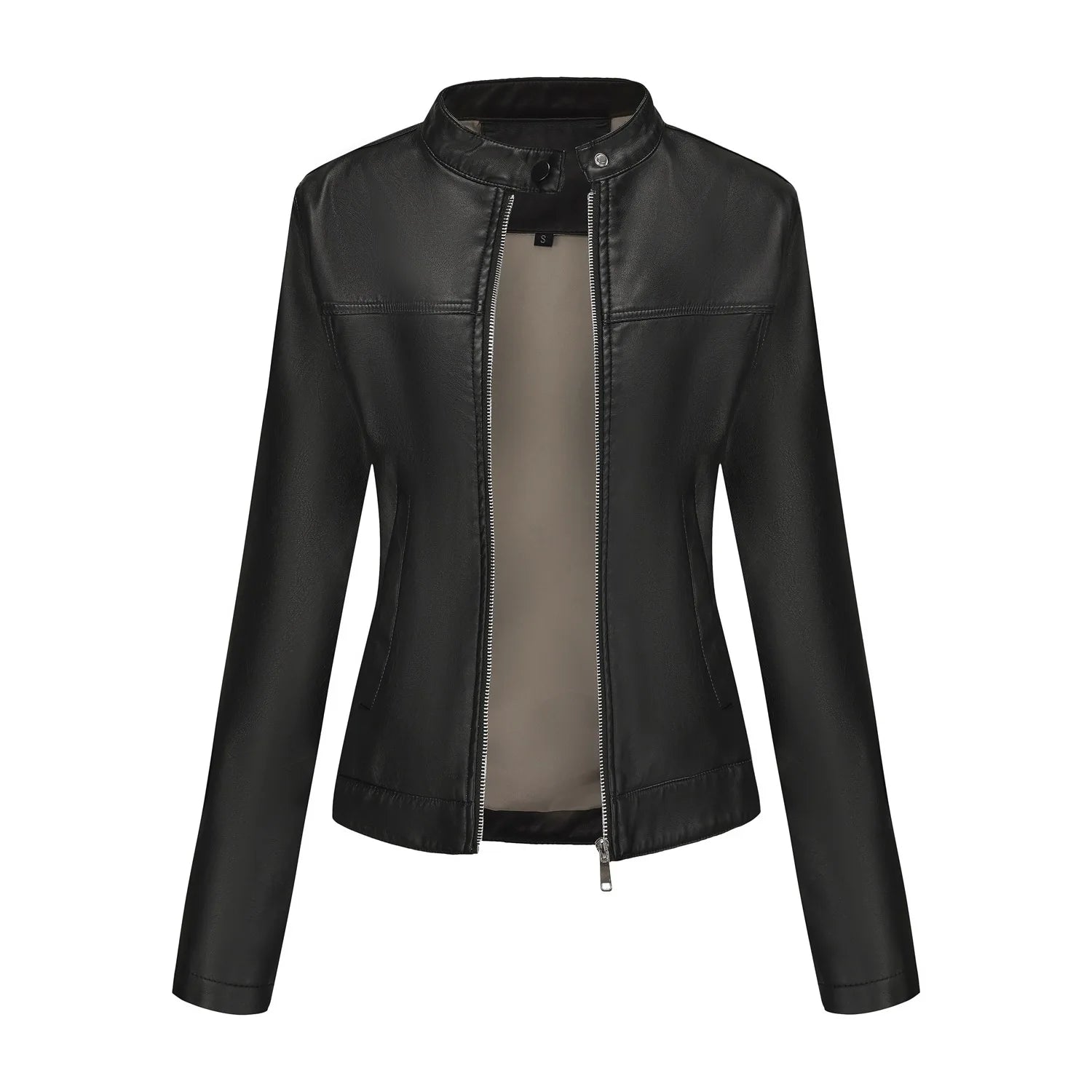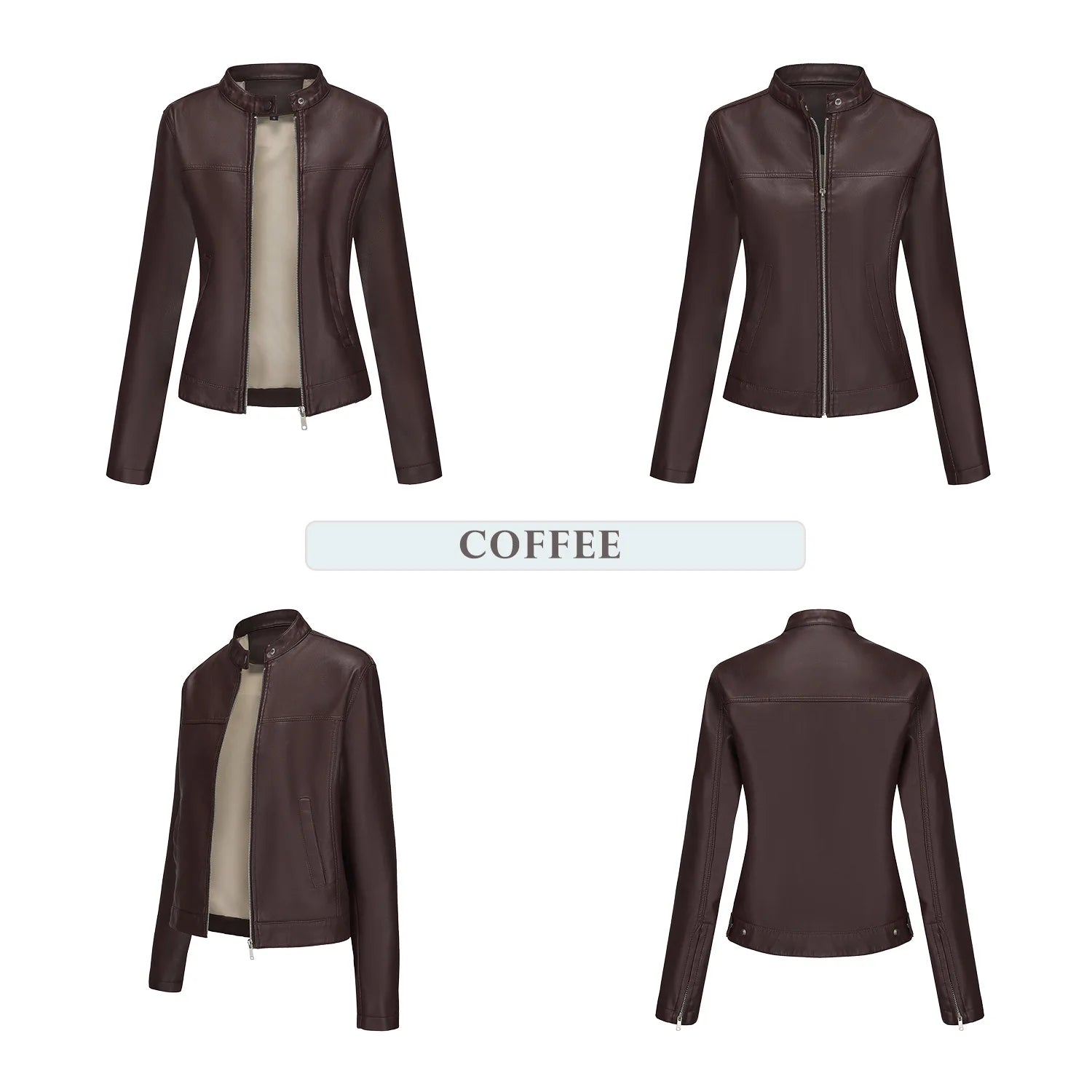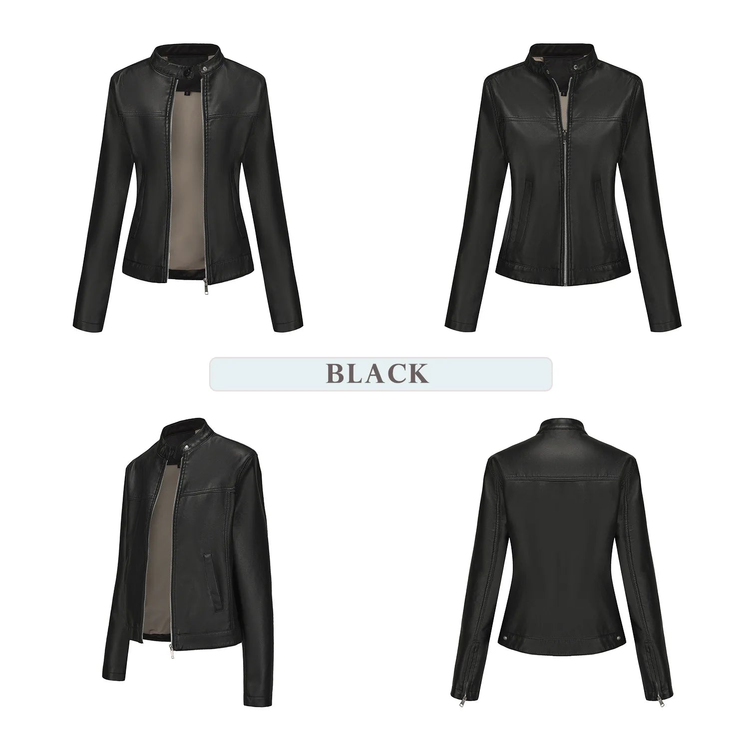Black Women's Fitted Leather Jacket with Front Zipper & Side Pockets, Available in Brown, Navy Blue, and Beige.