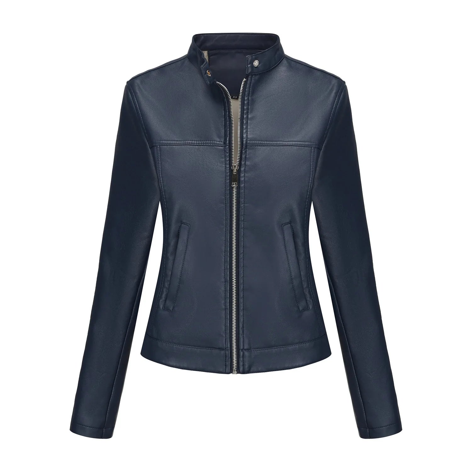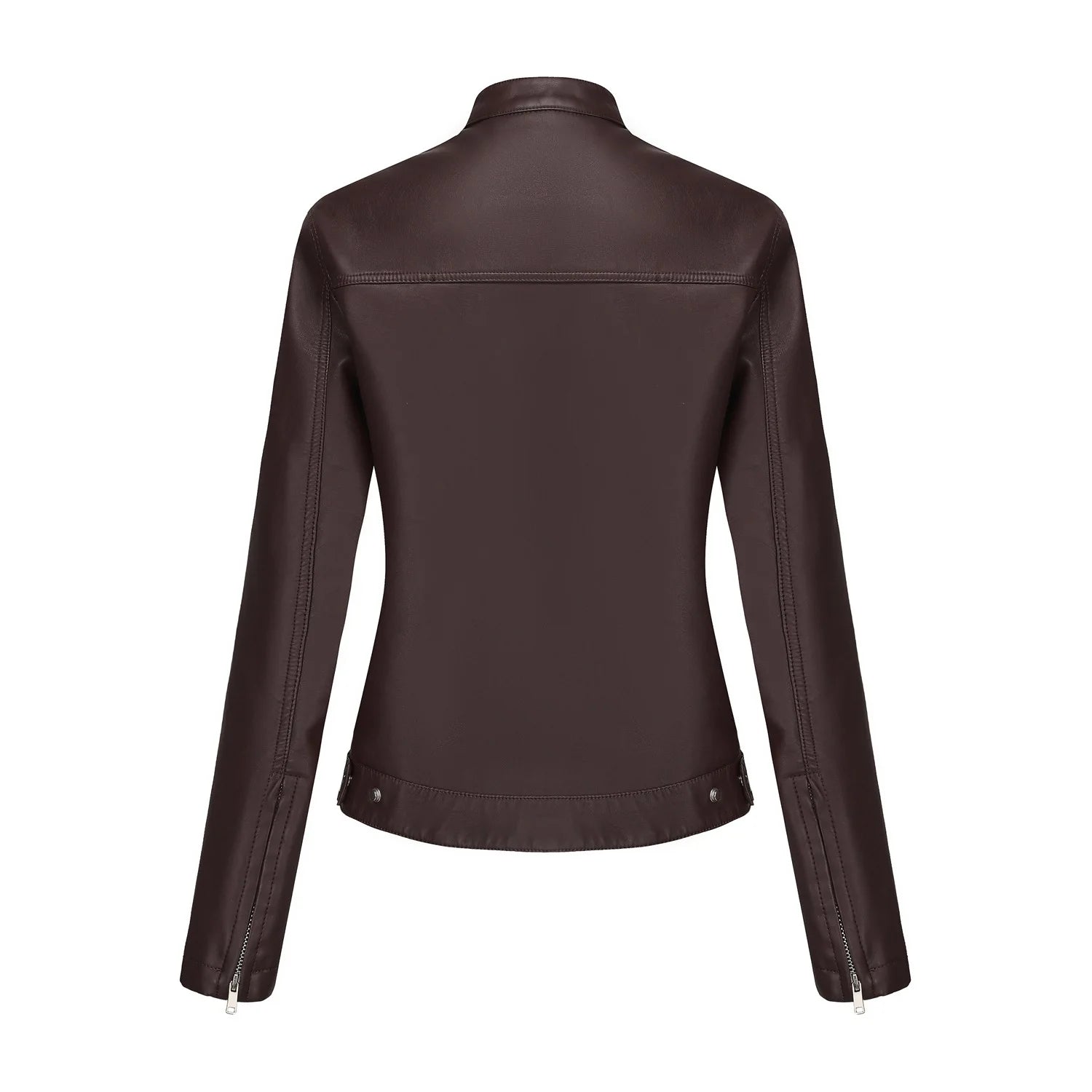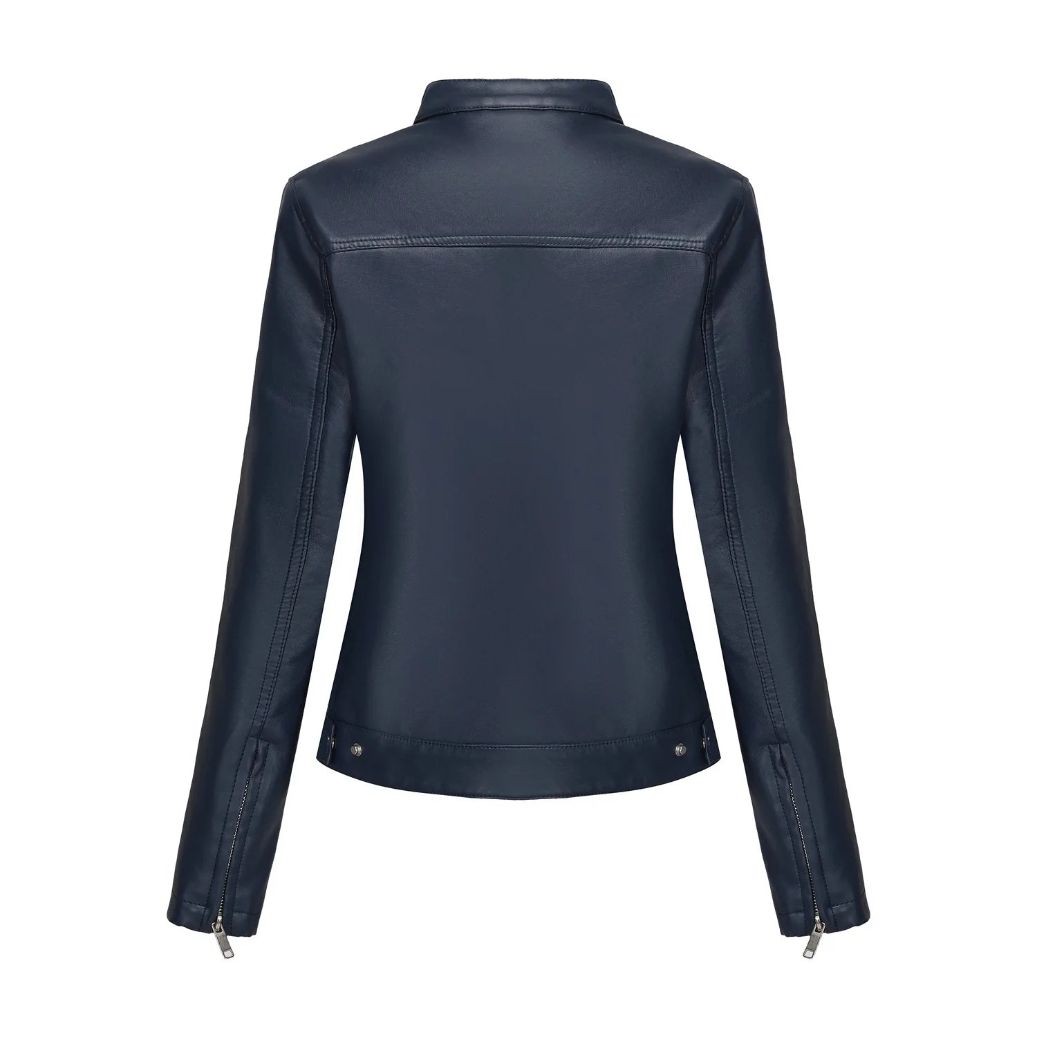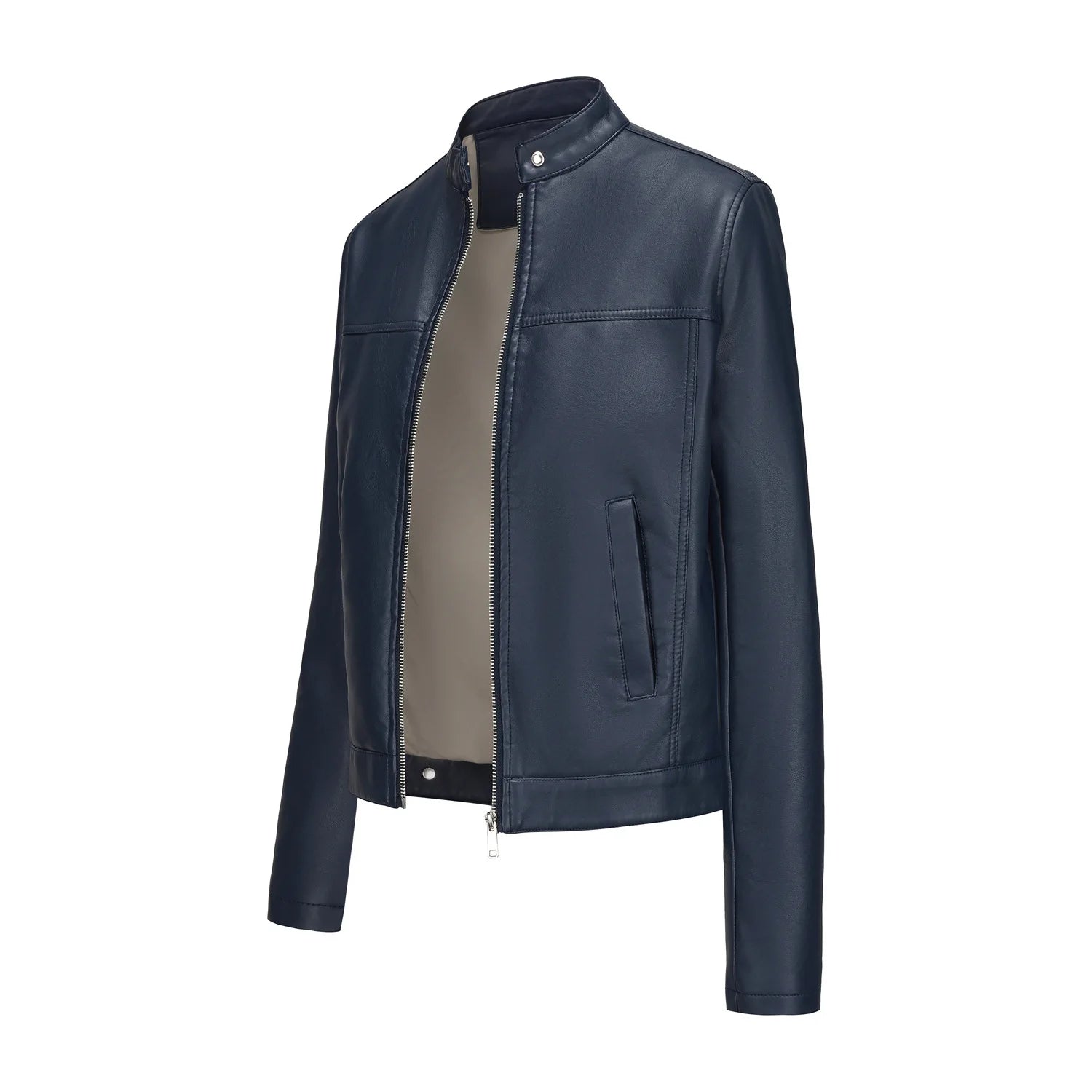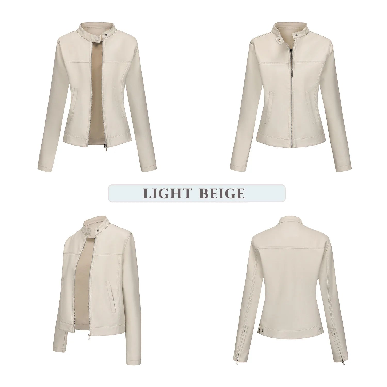 Black Women's Fitted Leather Jacket with Front Zipper & Side Pockets, Available in Brown, Navy Blue, and Beige.