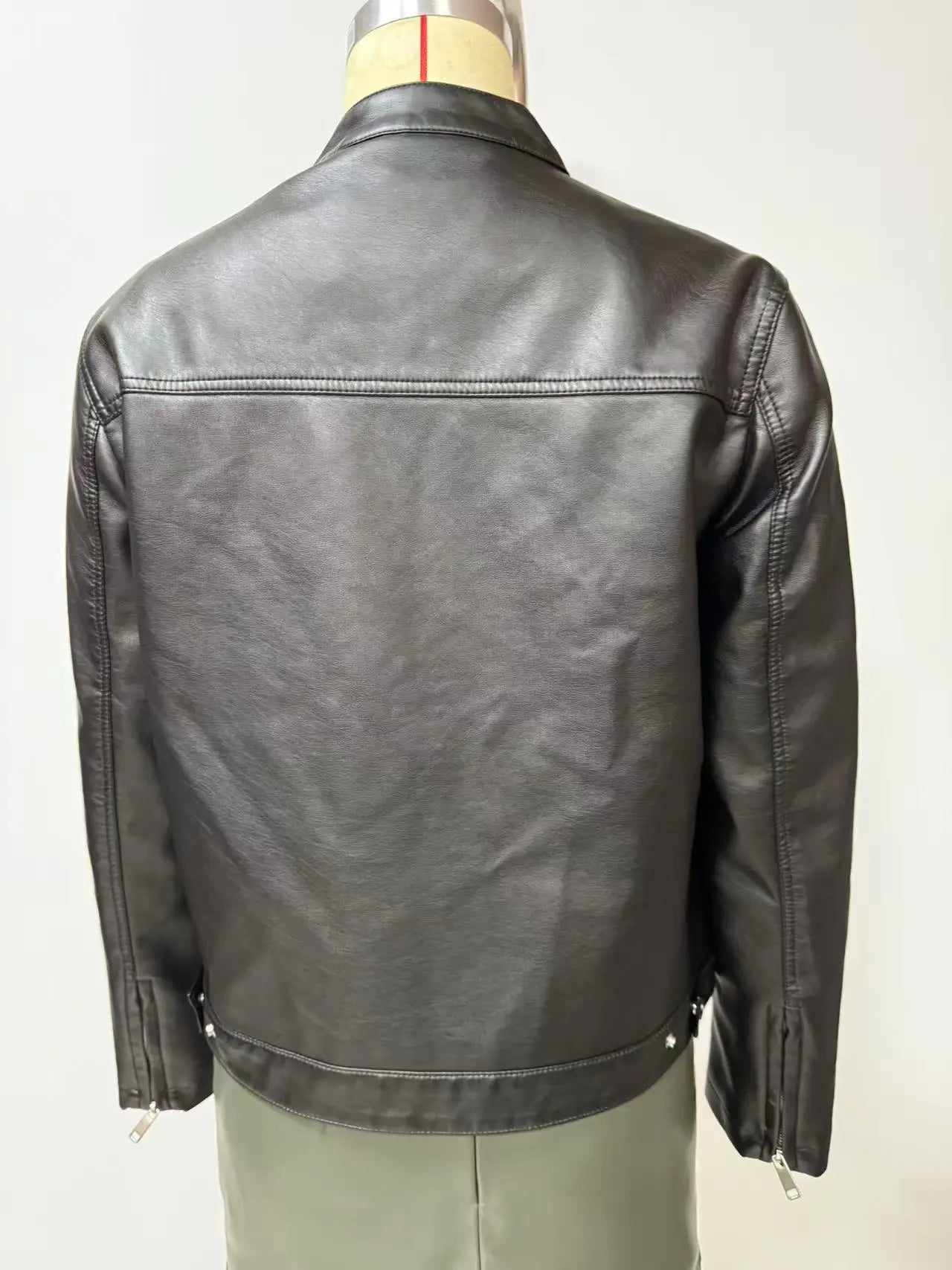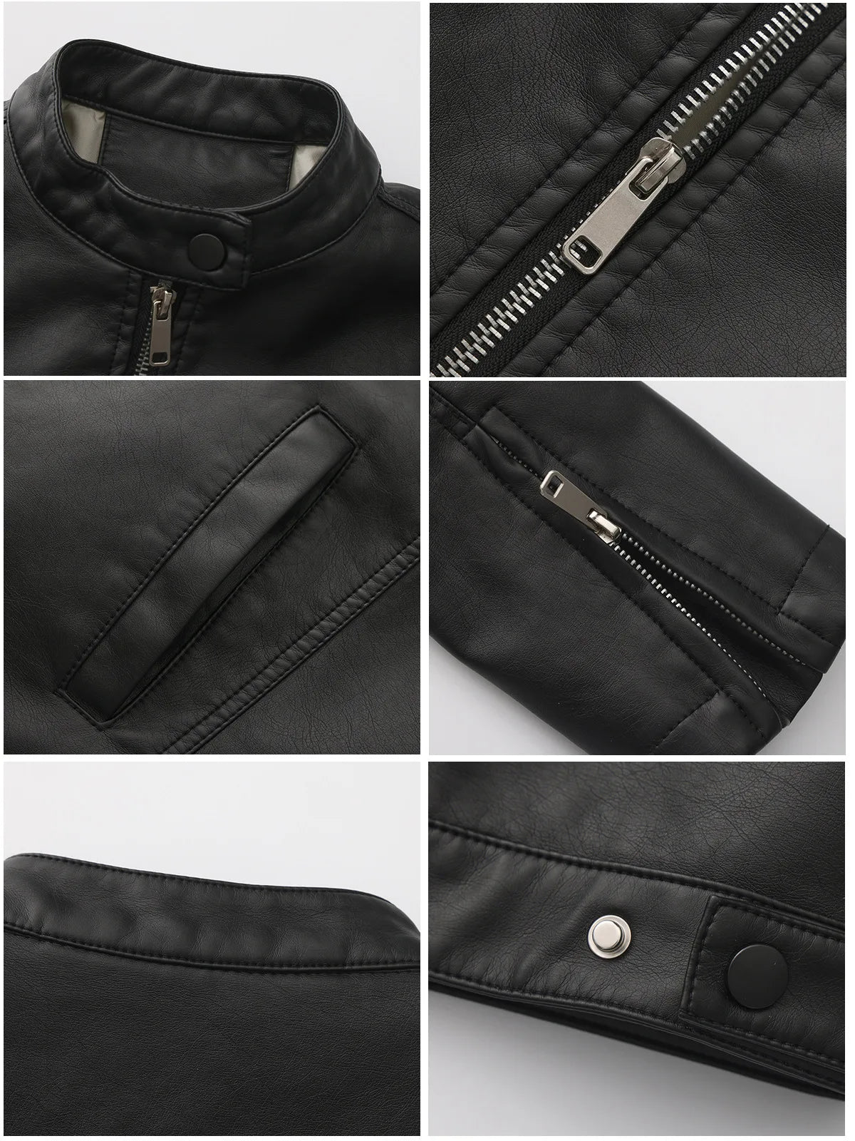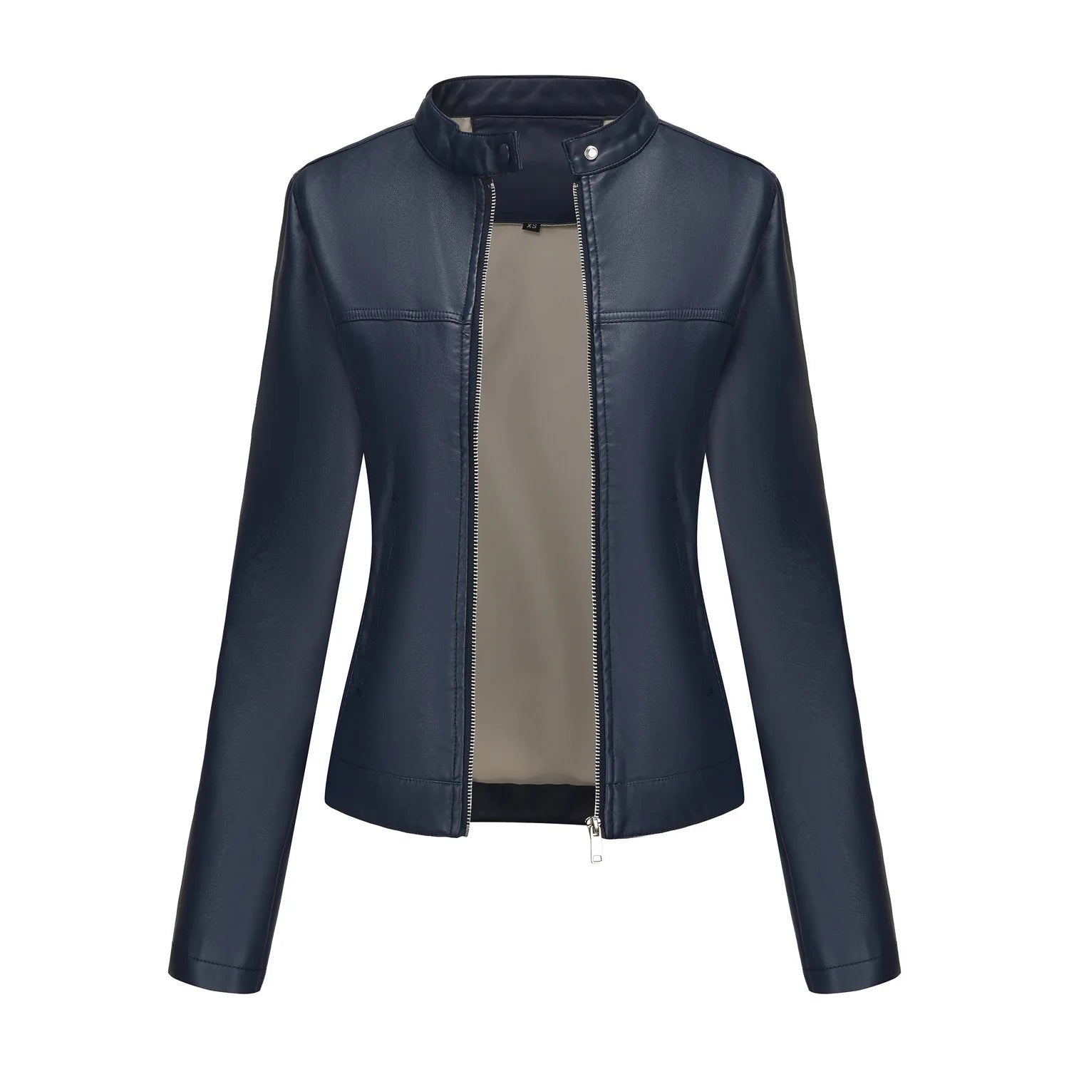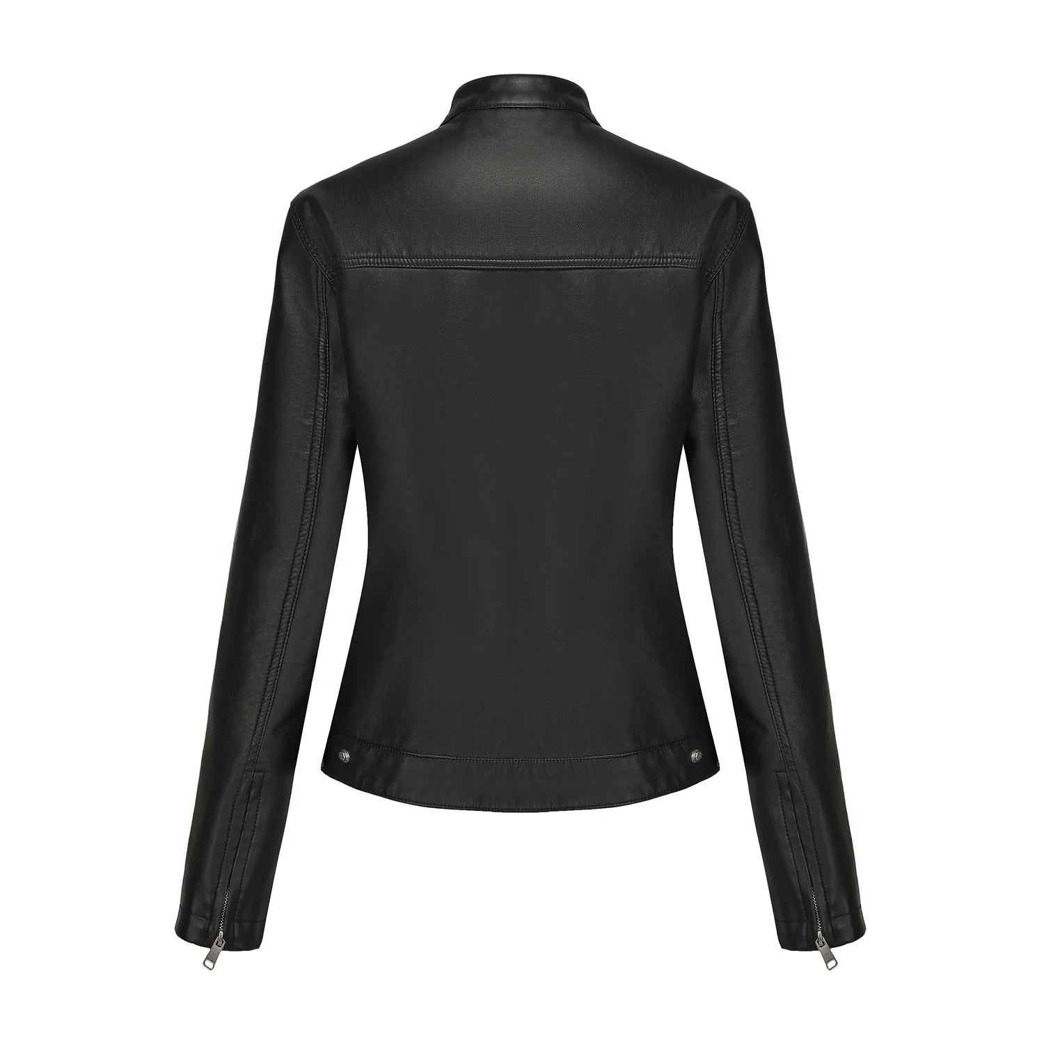 Black Women's Fitted Leather Jacket with Front Zipper & Side Pockets, Available in Brown, Navy Blue, and Beige.