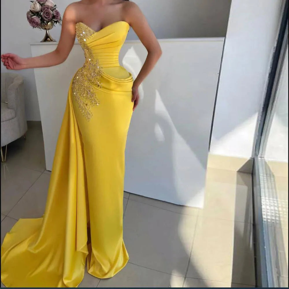 Customized Satin Yellow Mermaid Prom Dresses Crystals Sequined Sweetheart Neck Evening Formal Party Second Birthday Gown