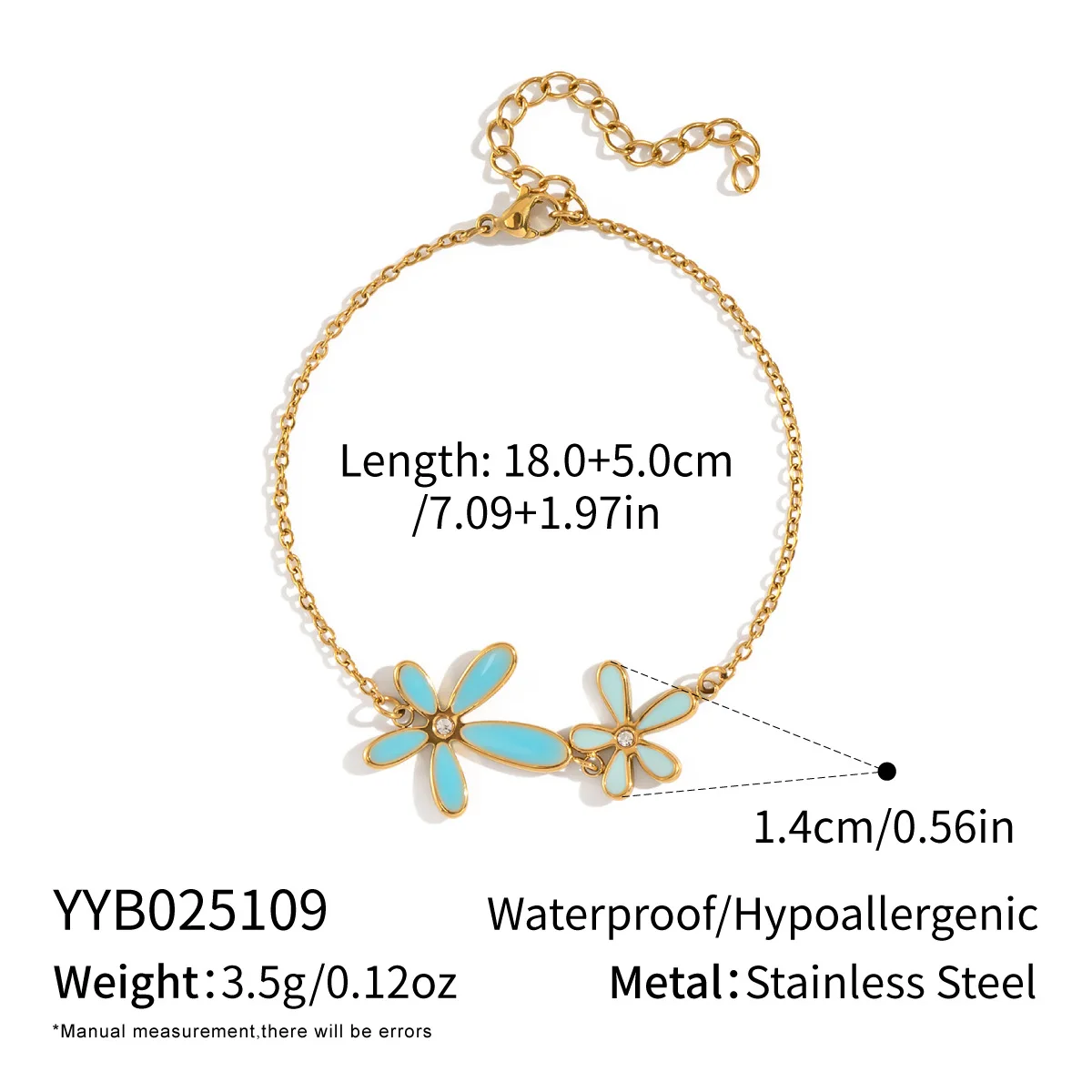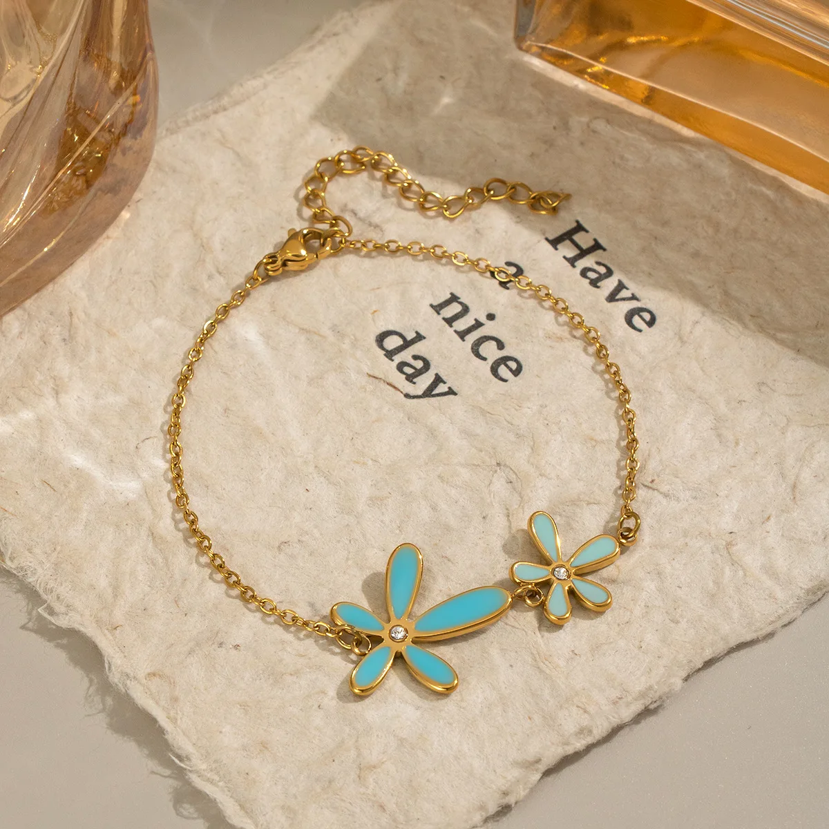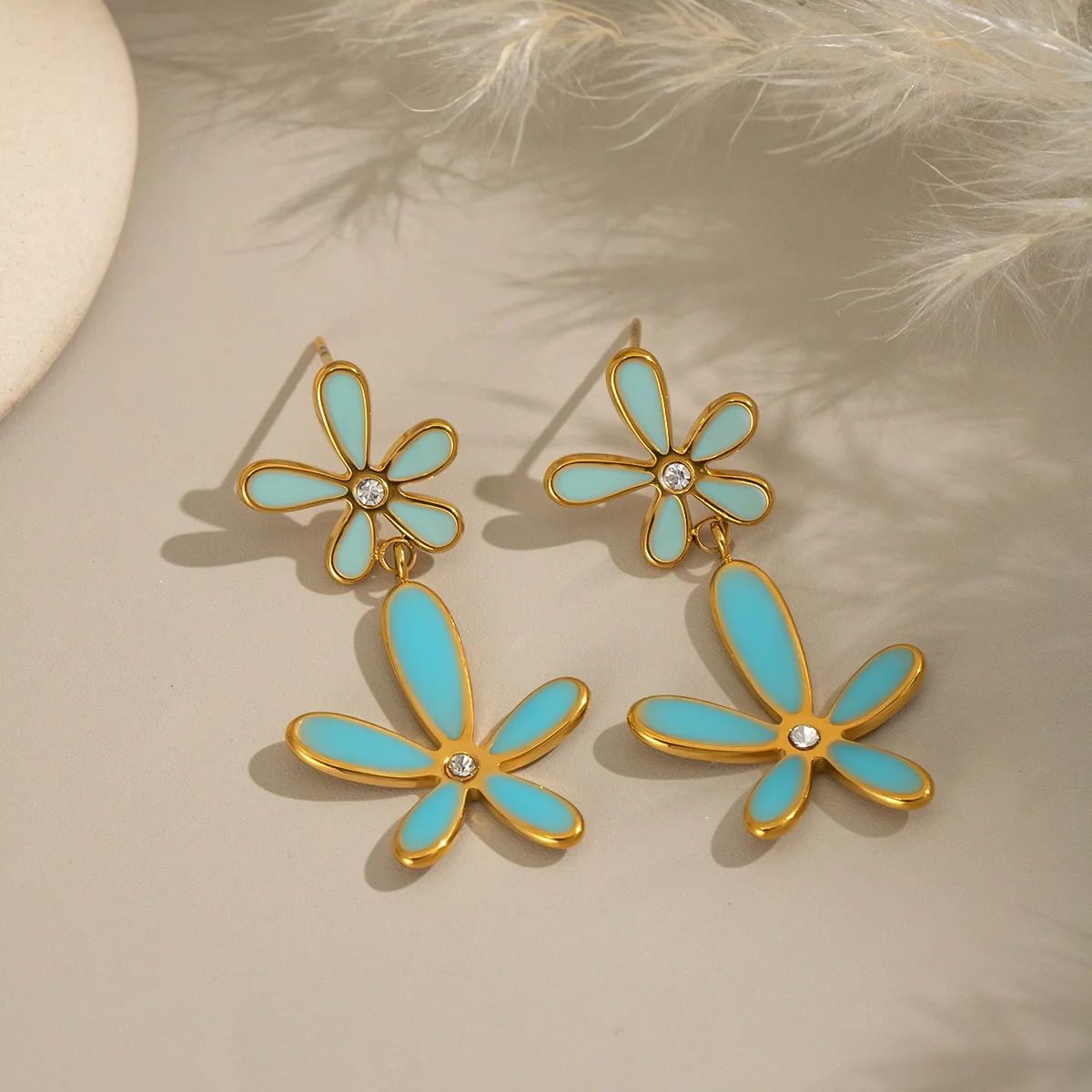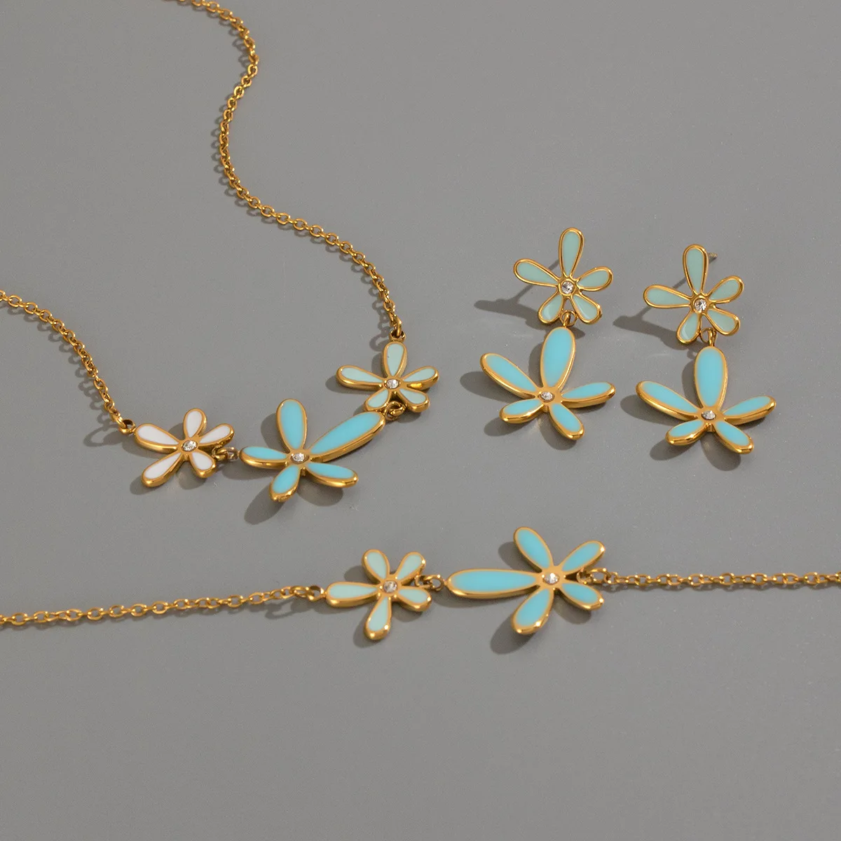 Cute Dopamine White Blue Oil Drop Diamond Flower Necklace 18K Gold-plated Stainless Steel Jewelry Set for Women Wholesale