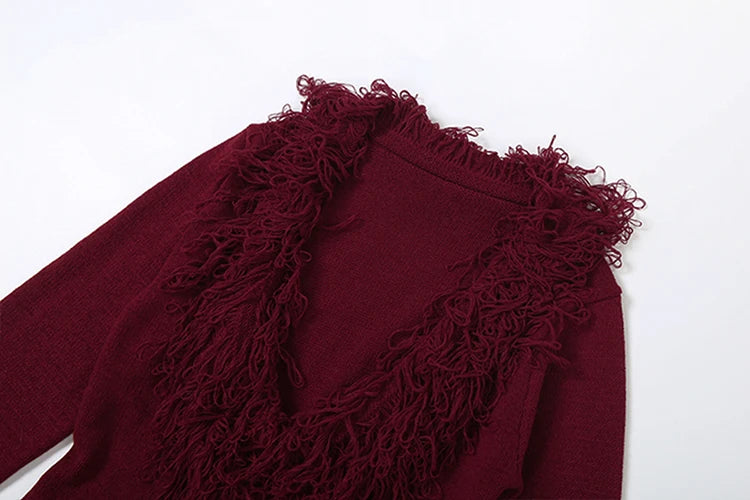 Cutenew Knit Deep V-Neck Furry Tassel Dress Women Winter Trend Sexy Elegant Peach Hip Christmas Party Stretch Slim Bodycon