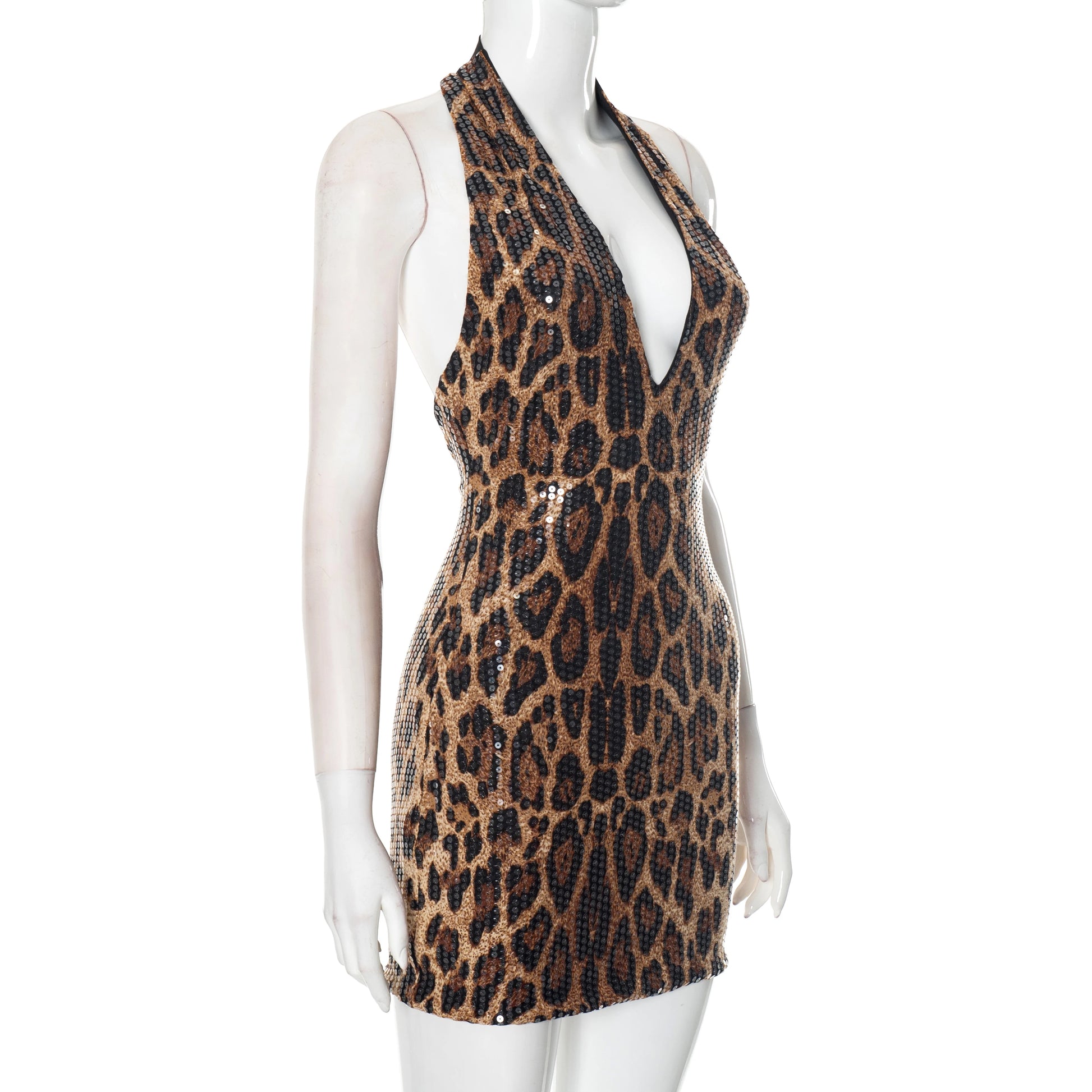 CUTENOVA 2025 Summer New Women'S Sexy Sleeveless Hanging Neck Leopard Print Beaded Deep V-Neck Revealing Backpack Hip Dresses
