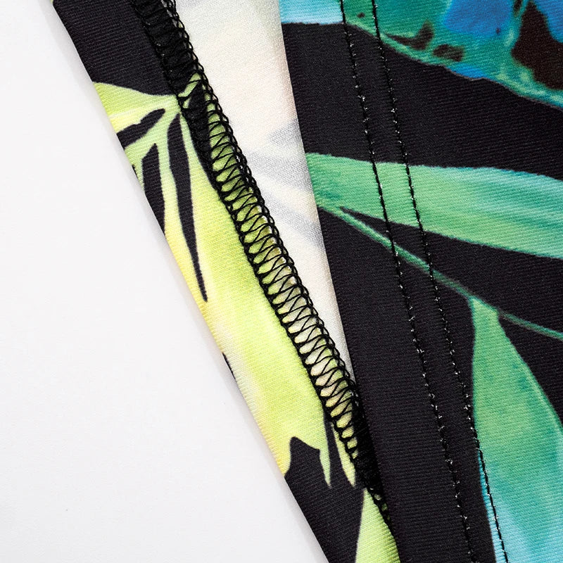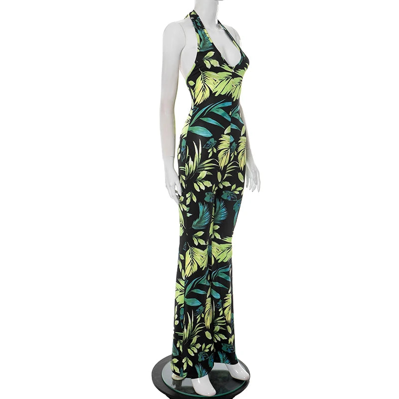 CUTENOVA Women'S V-Neck Tropical Botanical Print Hanging Neck Tie Backless Slim Flare Jumpsuit Fashion Elegant Street Jumpsuit