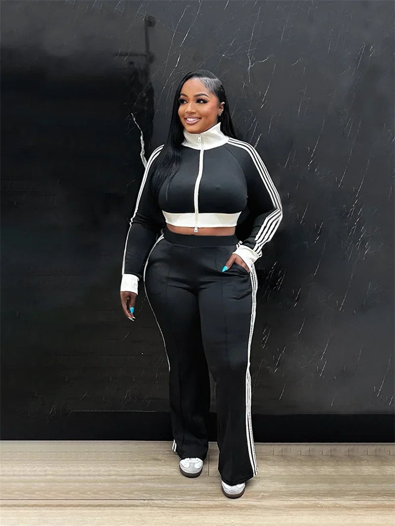 Doyerl Sporty Casual Tracksuit Women Two Piece Sets Striped Long Sleeve Zipper Cropped Jacket Top and Sweatpants Jogging Femme