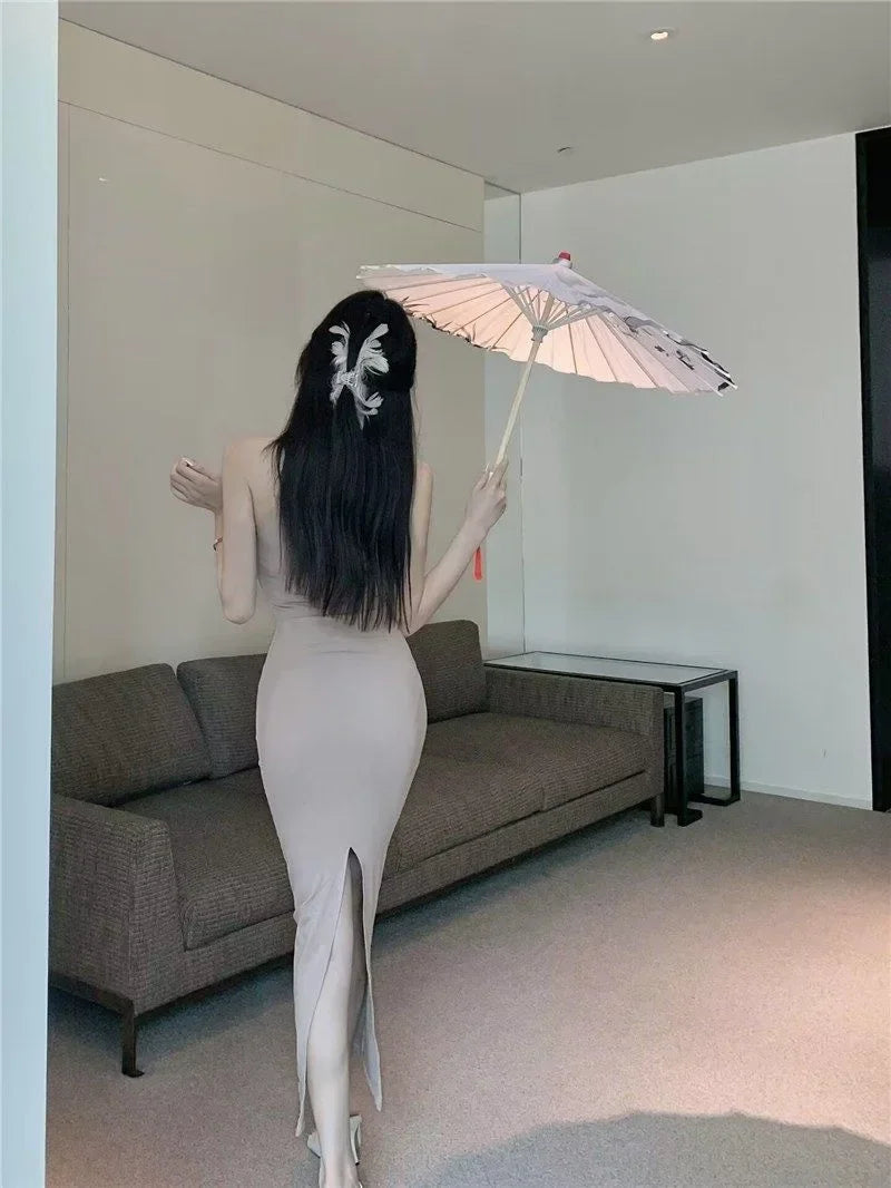 Elegant High Waist Long Sleeveless Dress Neck Hanging Wrap Skirt Slimming Goddess Style Polyester Fiber round Neck Gown
