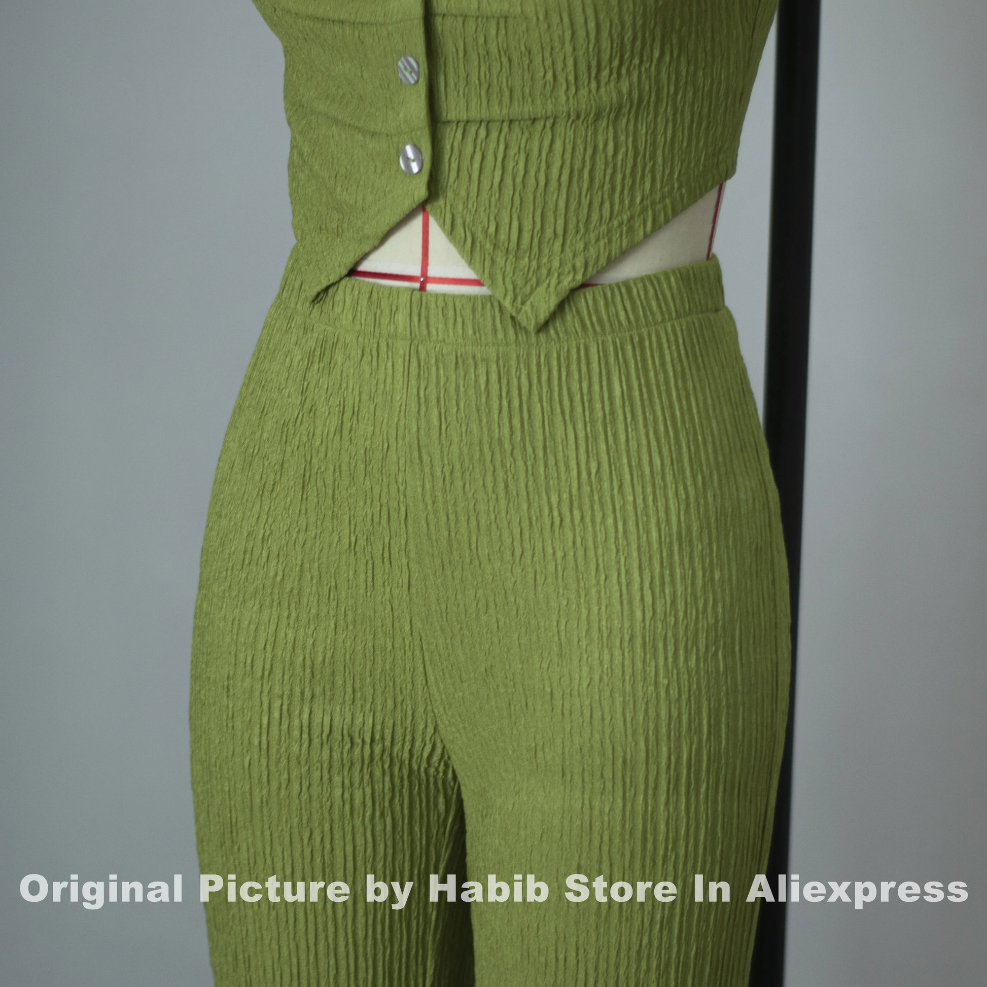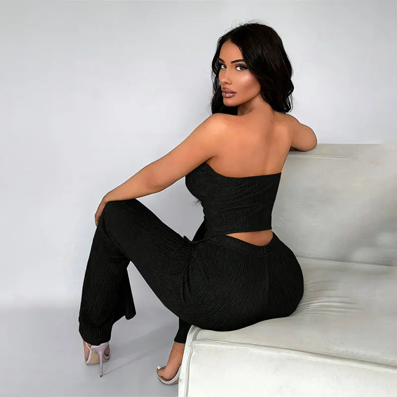 Elegant Women 2 Piece Set Midnight Striped Strapless Tube Bra Knitted Tank Top Bandage+Long Flare Pants Suits Vacation Clubwear