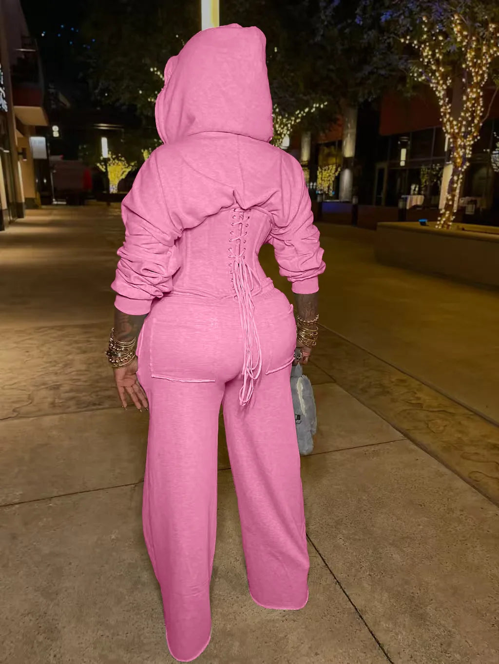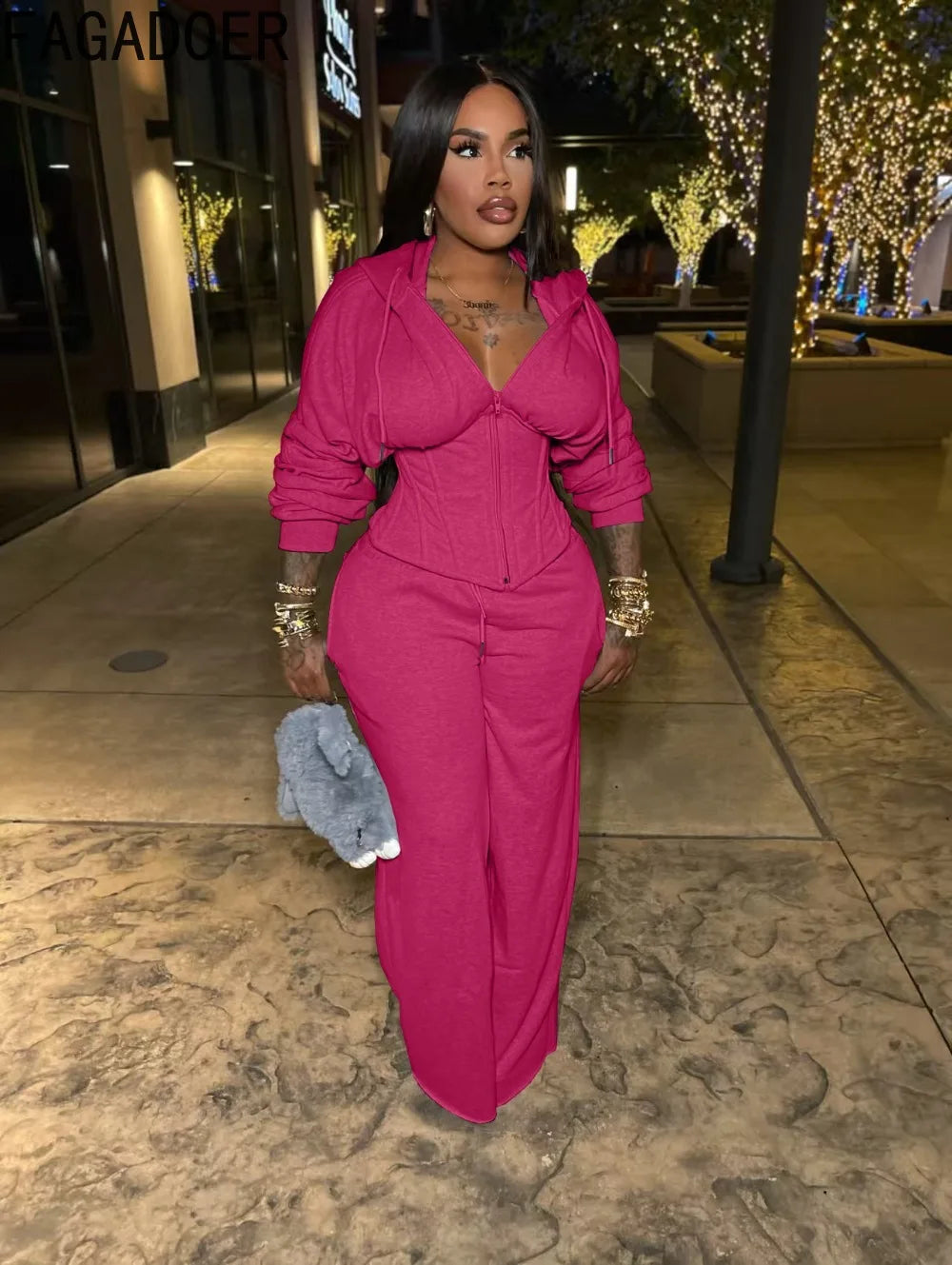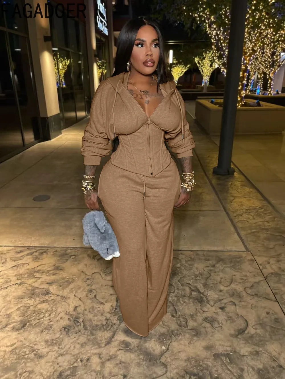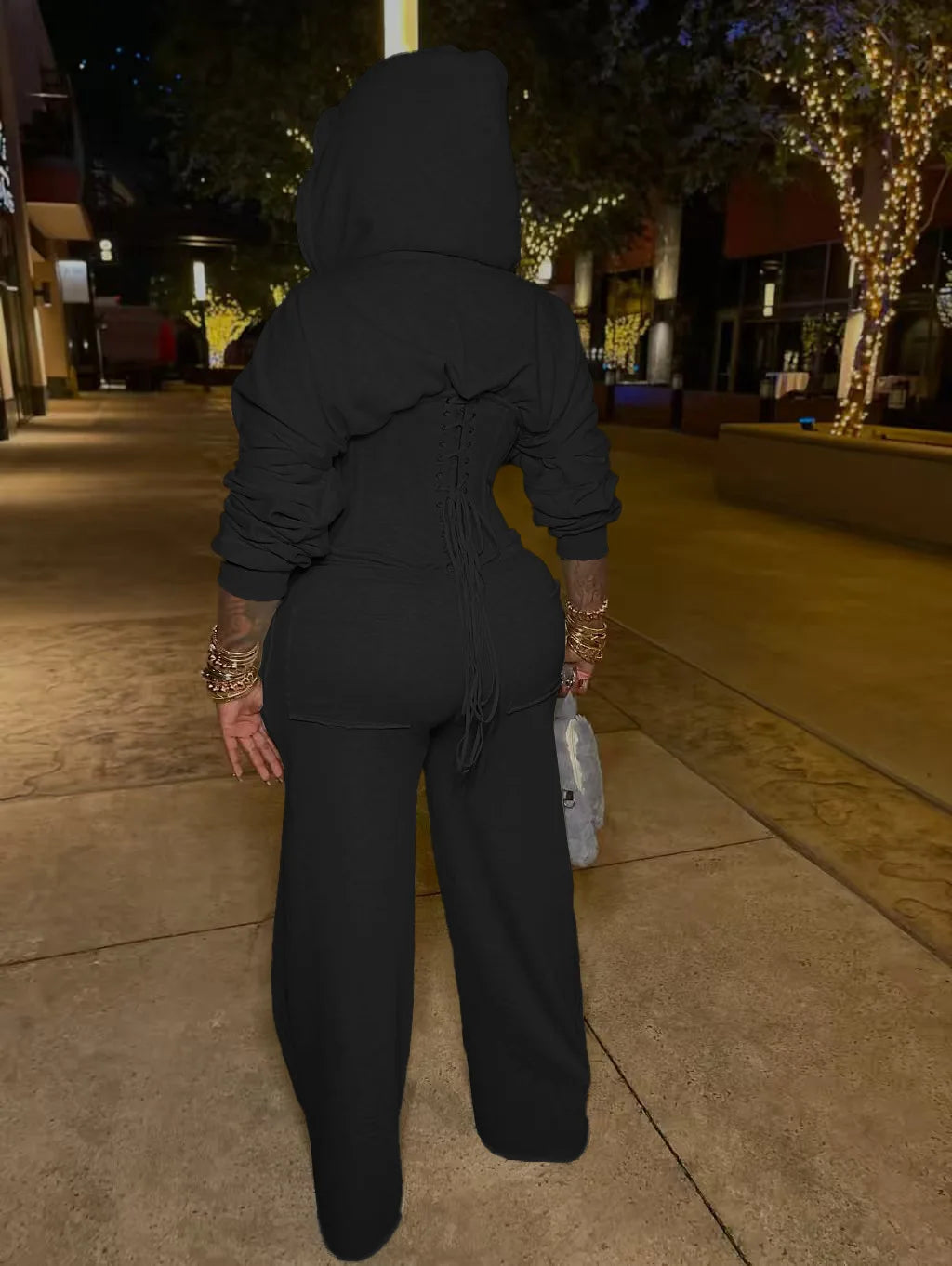 FAGADOER Casual 2 Pieces Set for Woman Outfits Solid Color Bandage Patchwork Hooded Crop Top and Pants Suit Female Streetwear