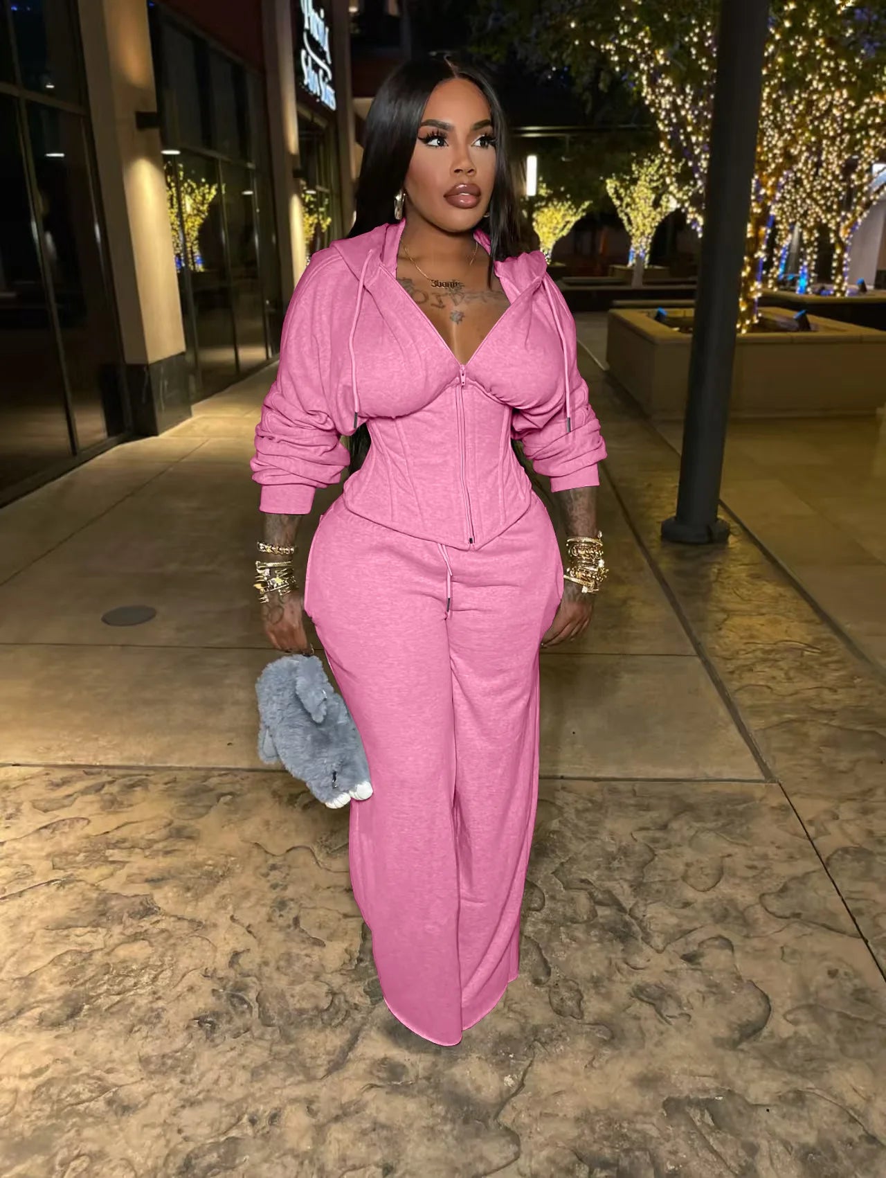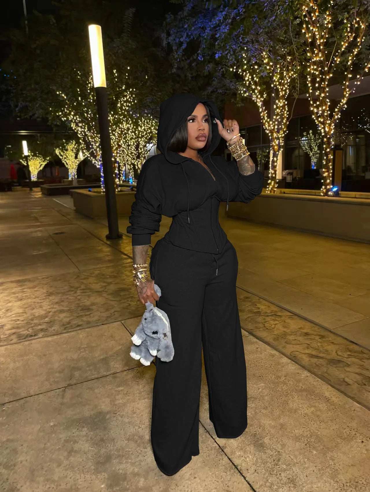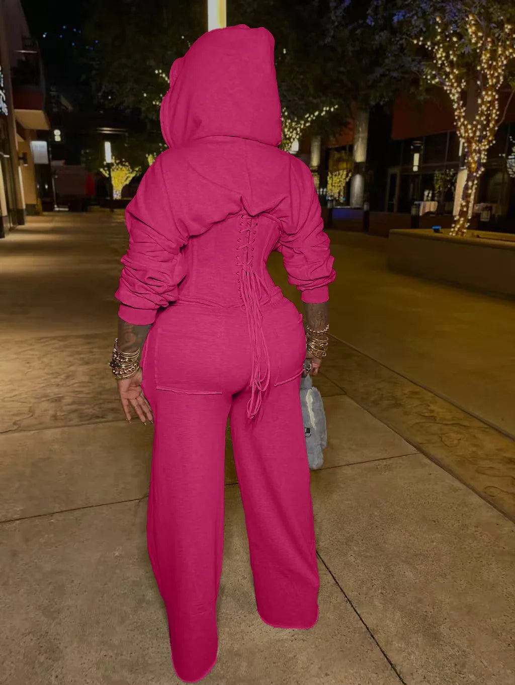 FAGADOER Casual 2 Pieces Set for Woman Outfits Solid Color Bandage Patchwork Hooded Crop Top and Pants Suit Female Streetwear