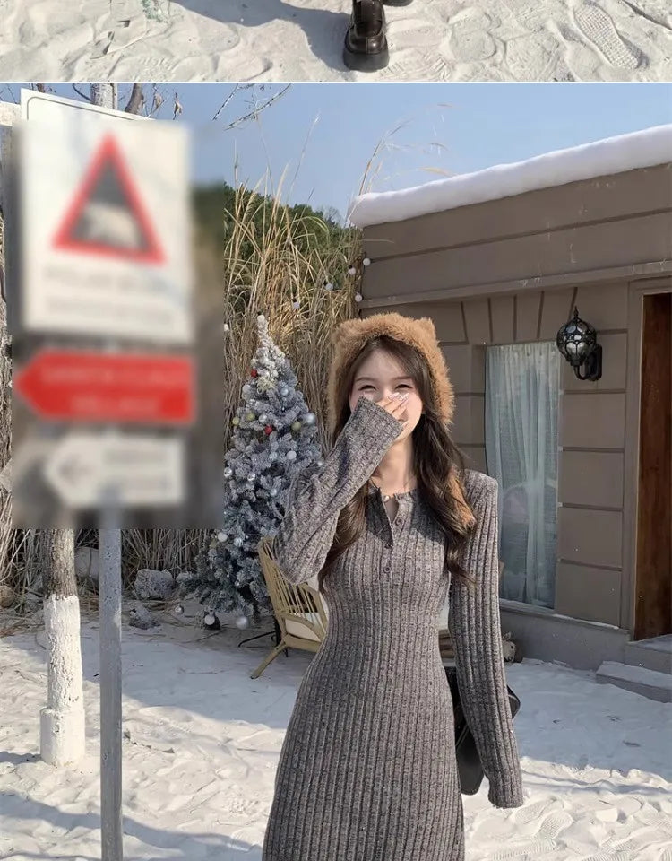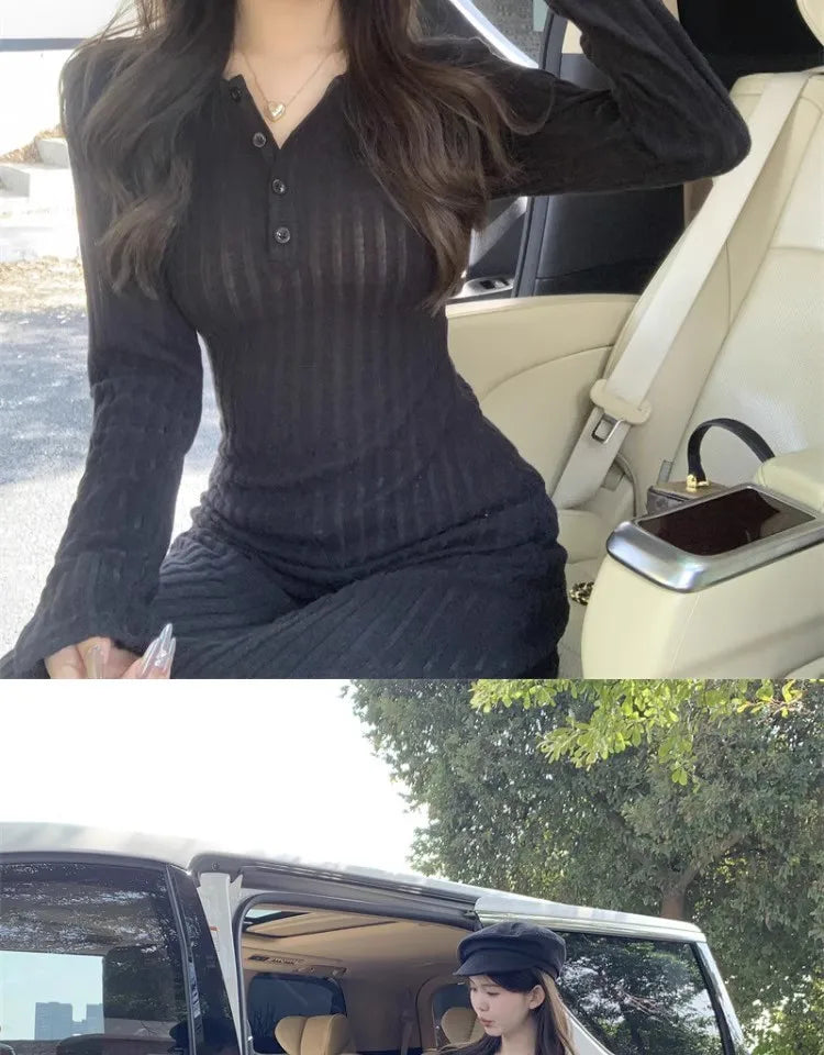 French Style Long Sleeve Knitted Dress Vintage Waist Cinching A- Line Skirt Women Autumn Winter New Arrival Slimming Inner Wear
