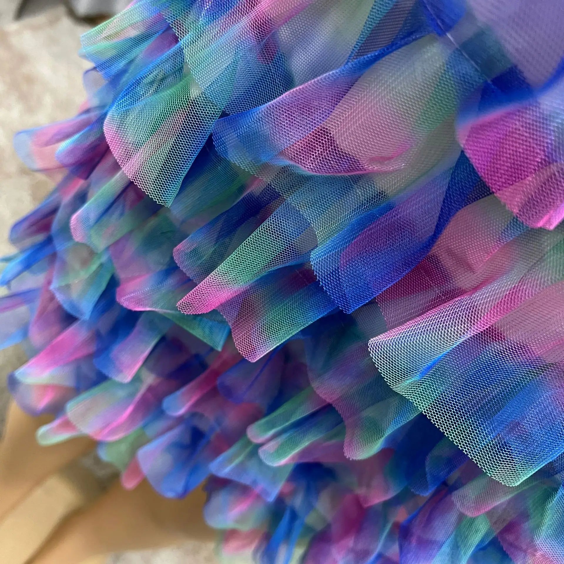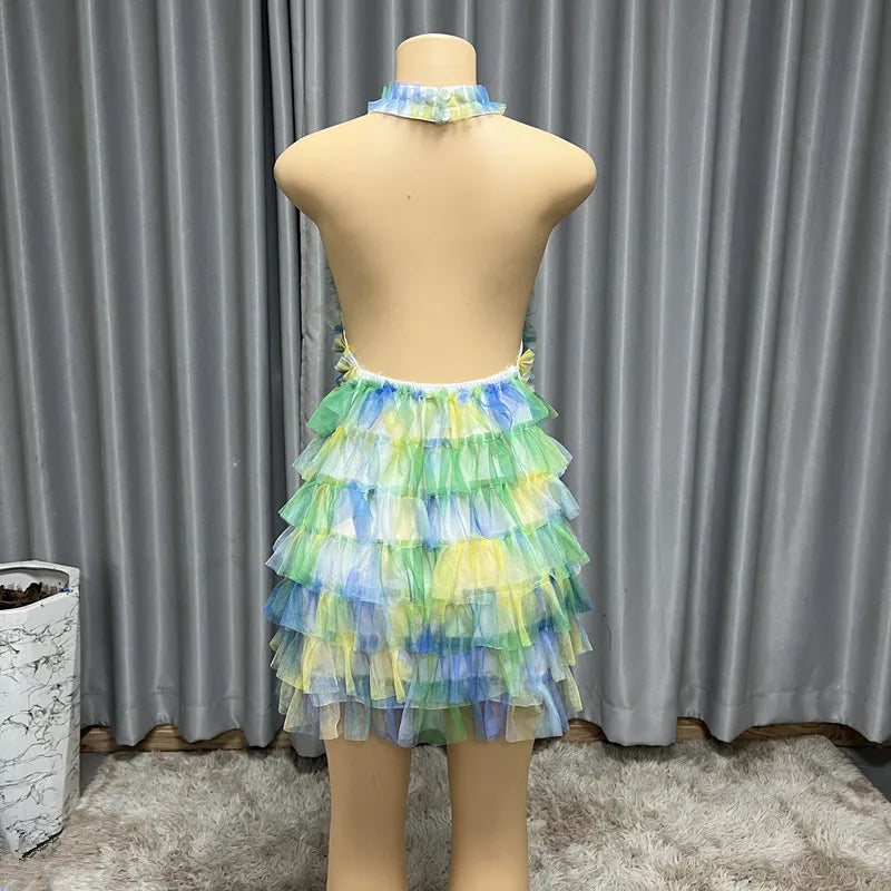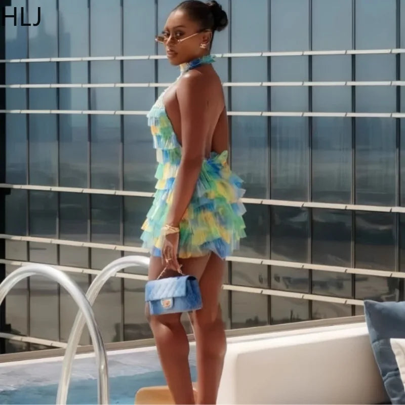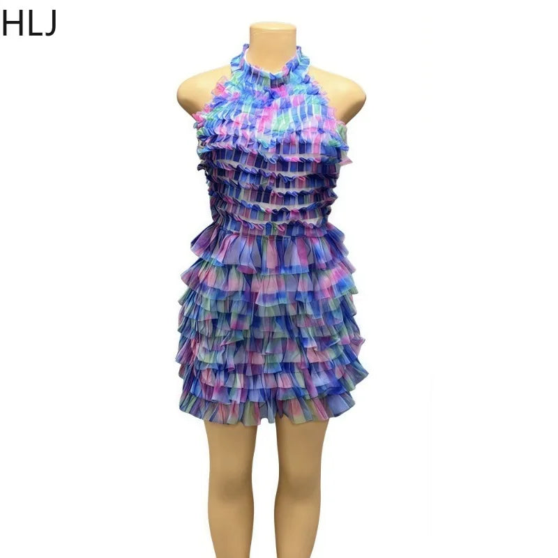 HLJ Sexy Mesh Ruched Patchwork Bodycon Dresses Women Cake Gradient Halter Backless Dress Female Streetwear Vestidos Summer New