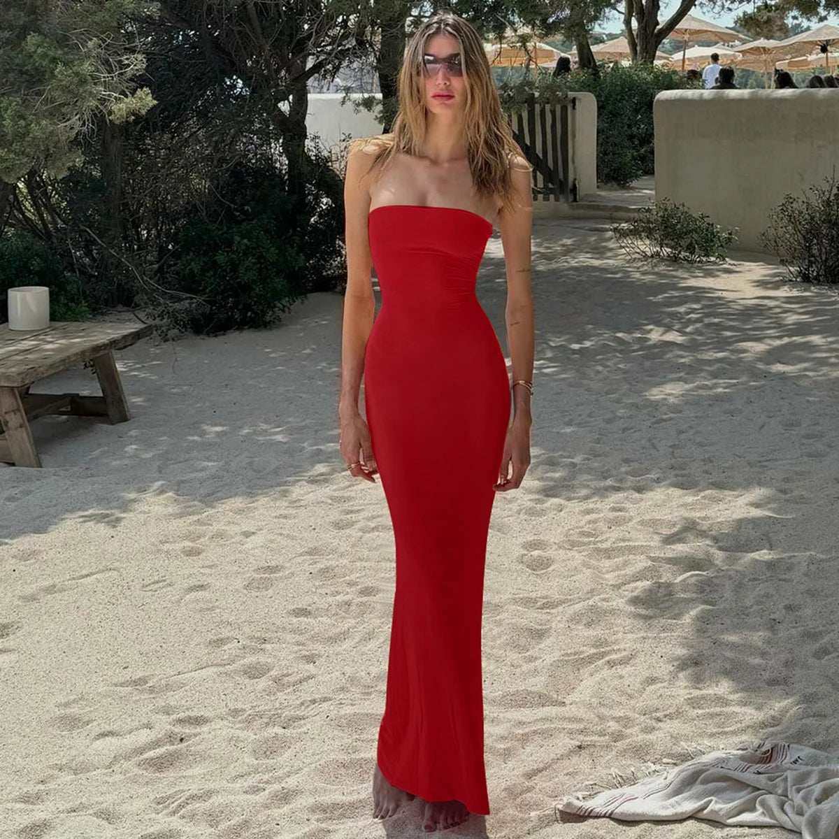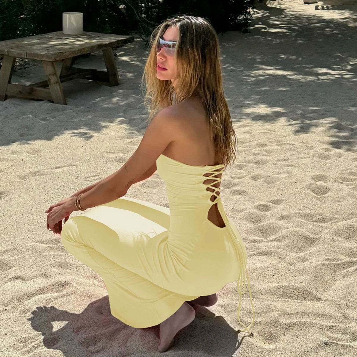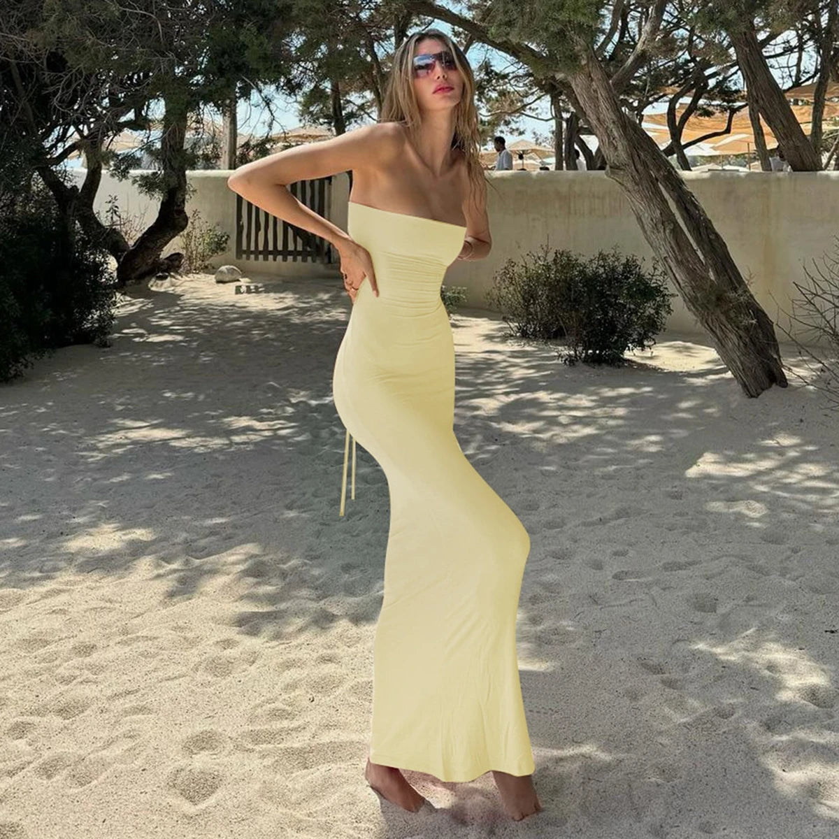 Hugcitar Elegant Women Solid Strapless Backless Bandage Sexy Bodycon Maxi Dress Summer Women Y2K Clothes Beach Vacation Party