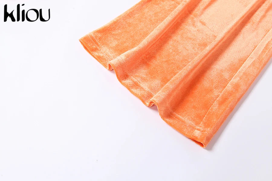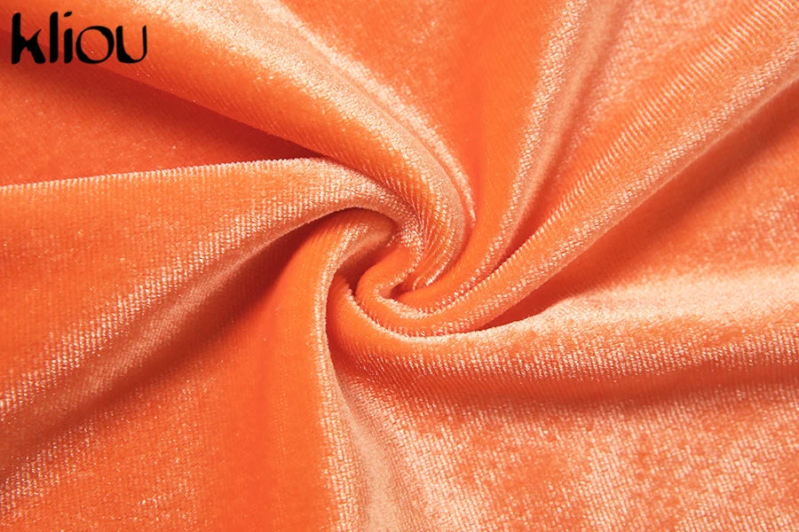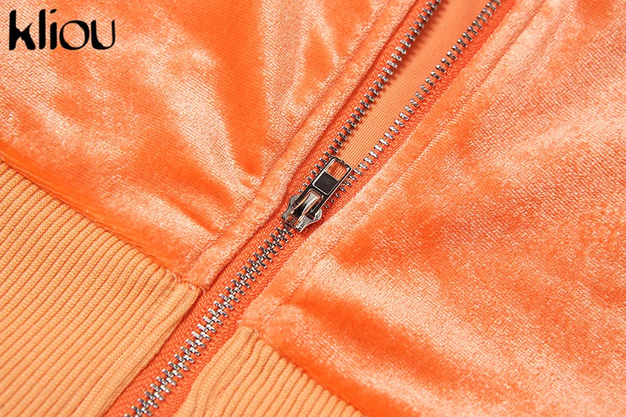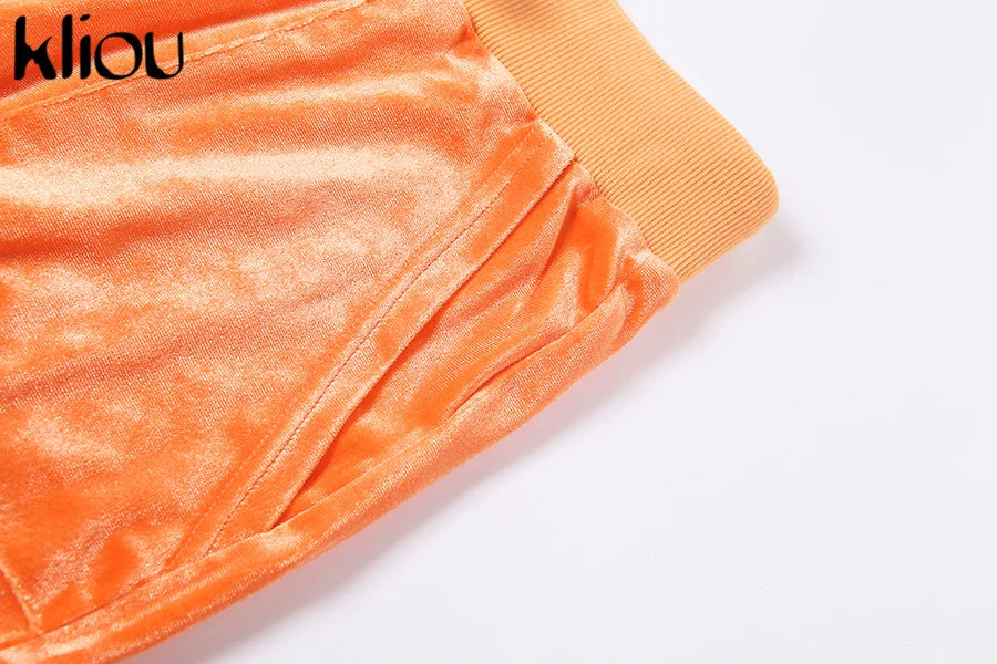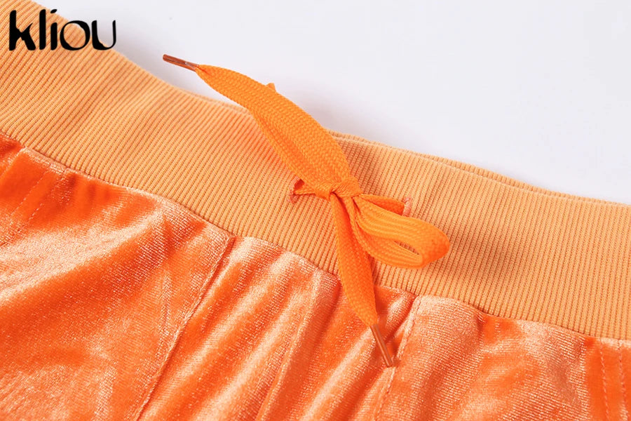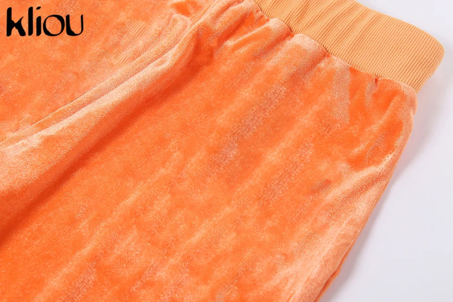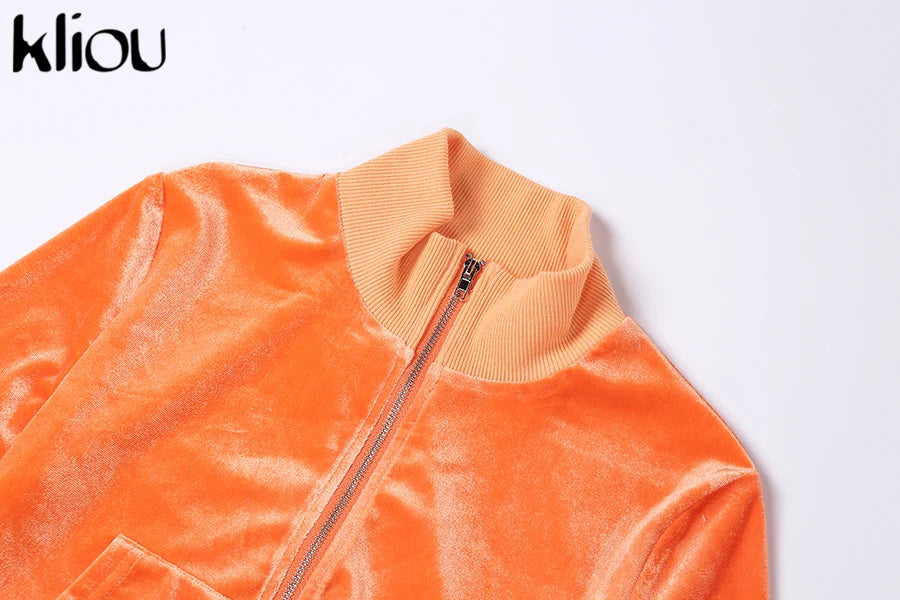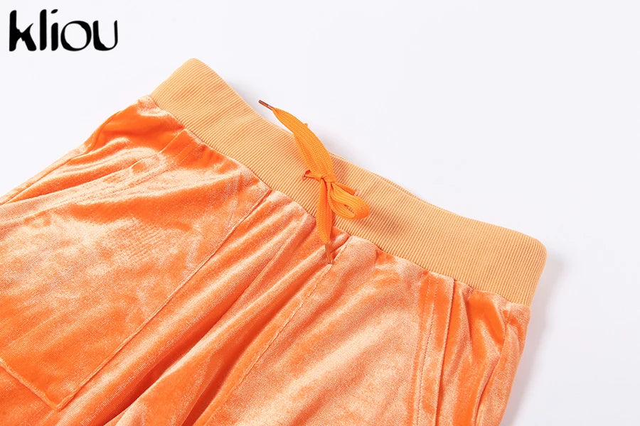 Kliou Solid Velour Two Piece Set Women Simple Casual Zipper Long Sleeve Turtleneck Top+Bandage Lace Slim Female Wide Leg Pants