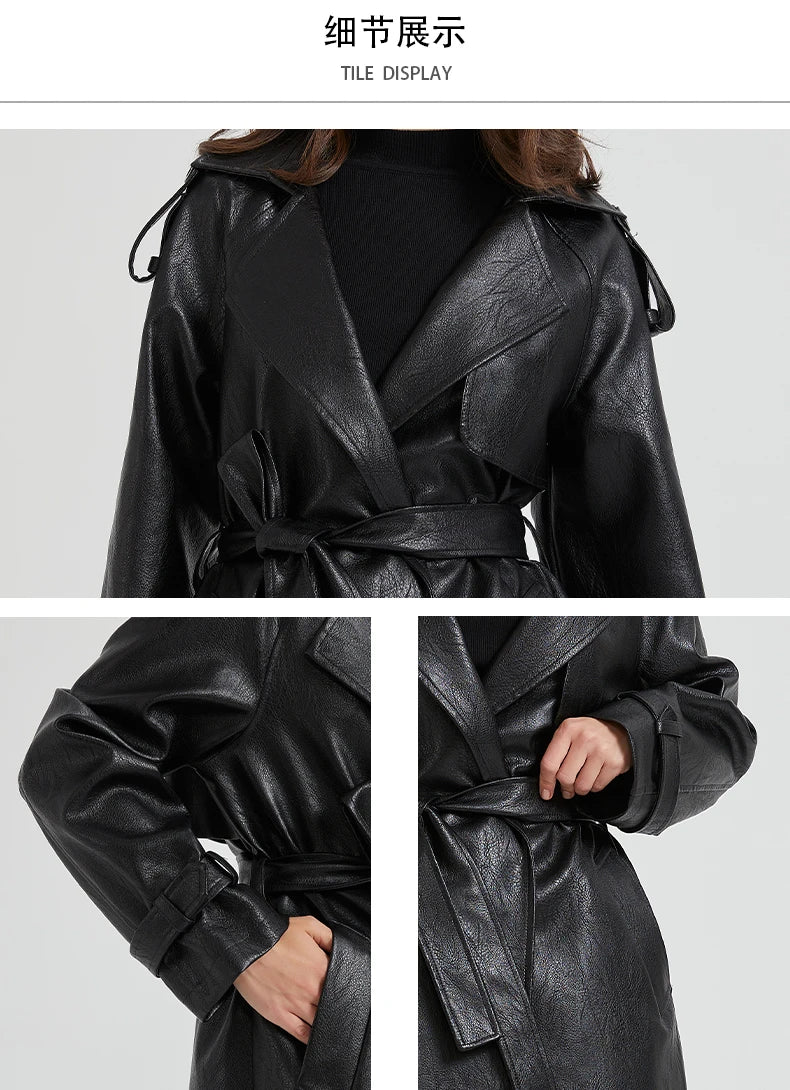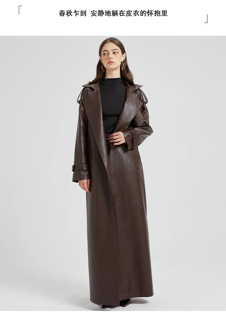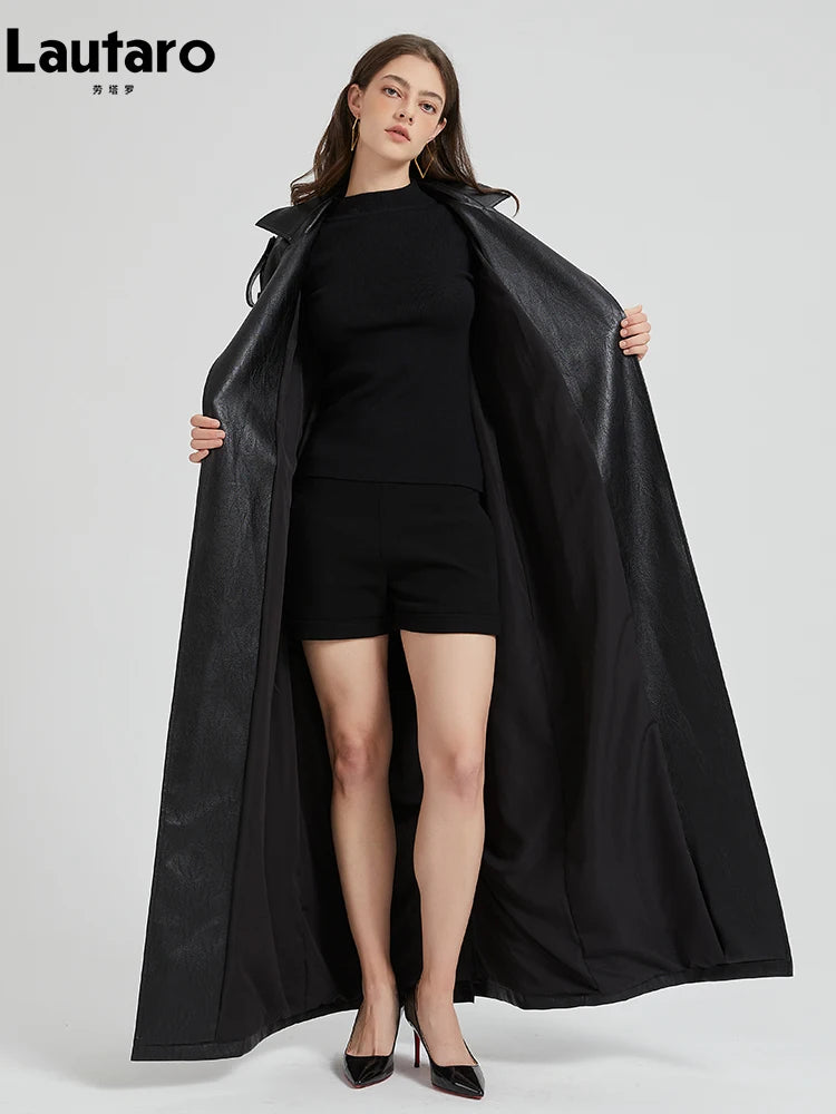 Lautaro Spring Autumn Extra Long Brown Pu Leather Trench Coat for Women Sashes Luxury Chic Overcoat Runway European Fashion 2024