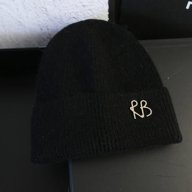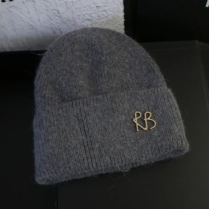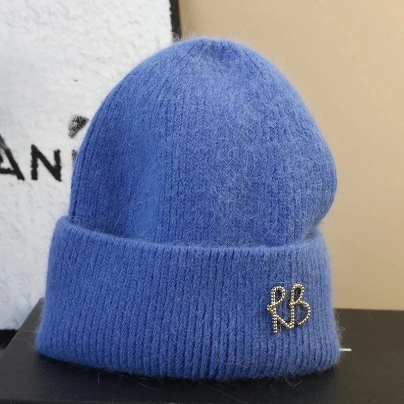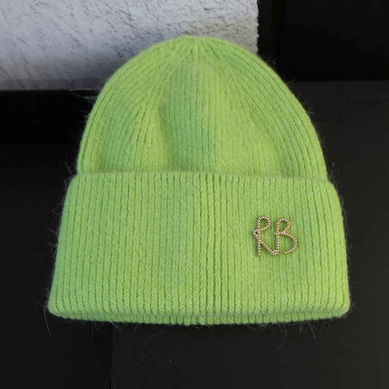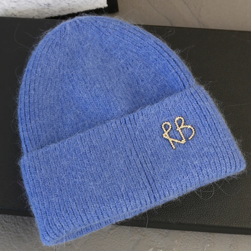 Letter Fluffy Angora Fur Beanies Winter Hat for Woman Luxury Fluffy Knited Hat Bonnet Lady Autumn Winter Warm Skullies Cap