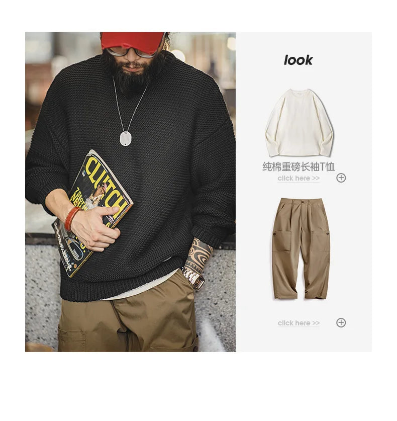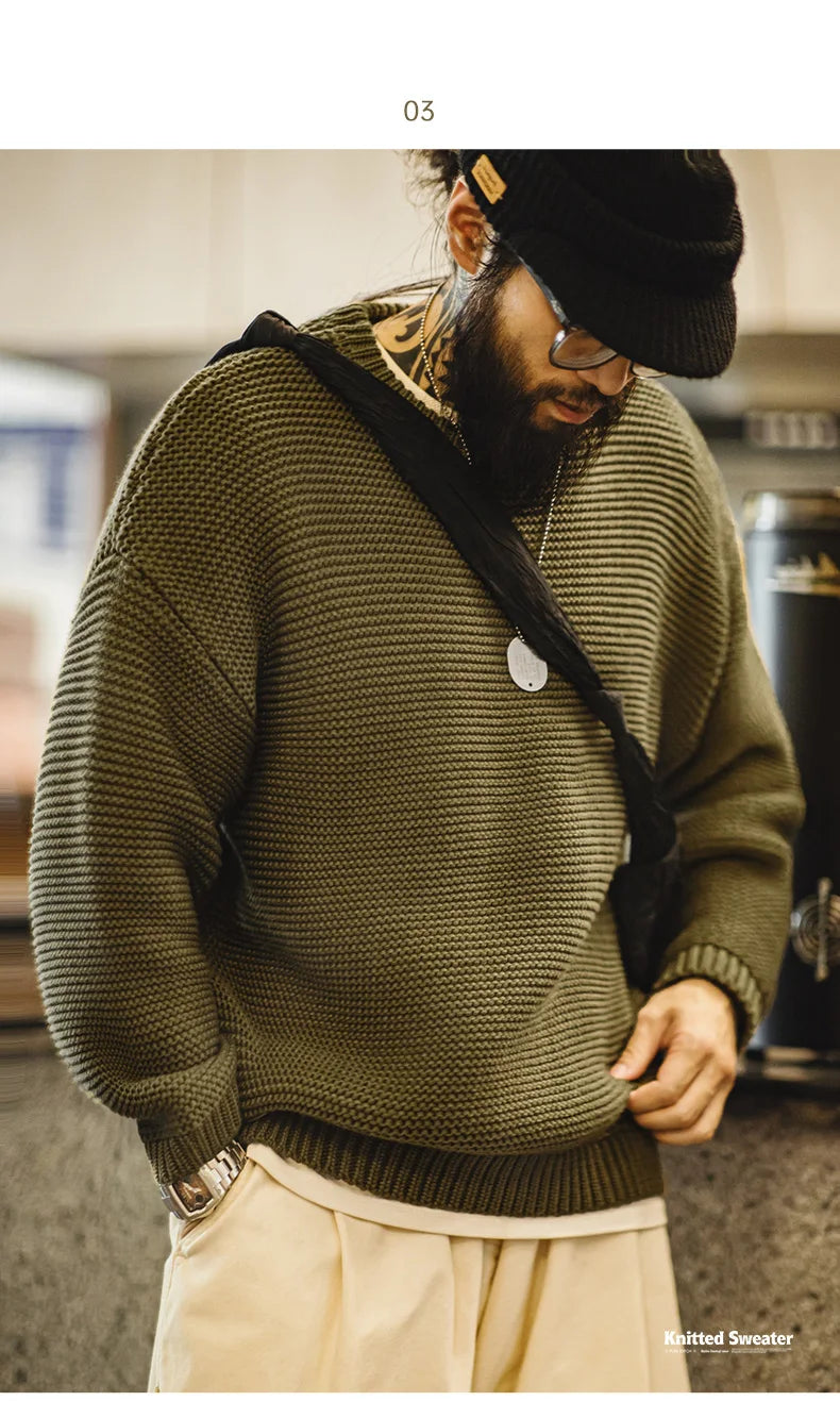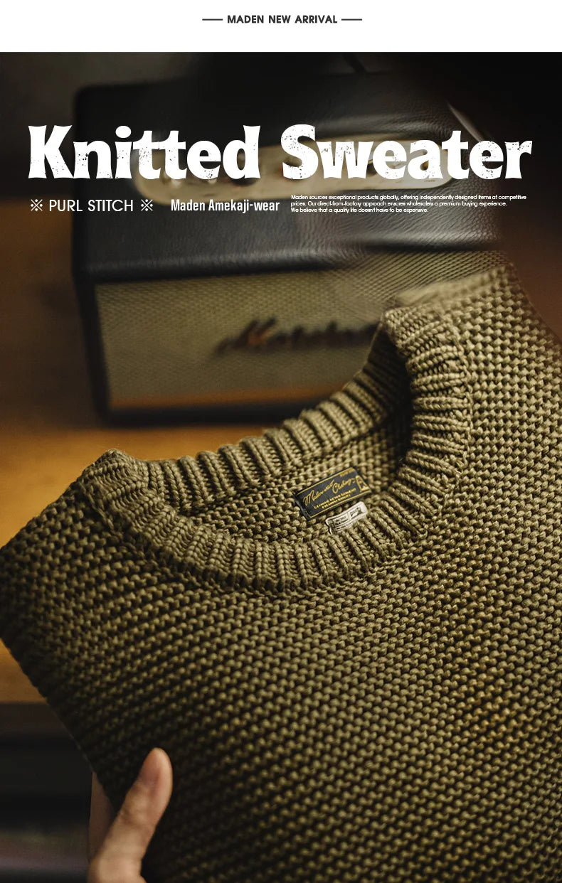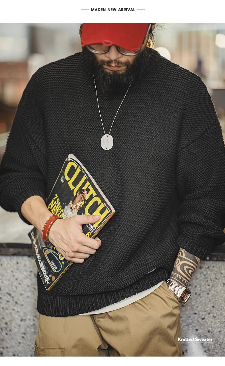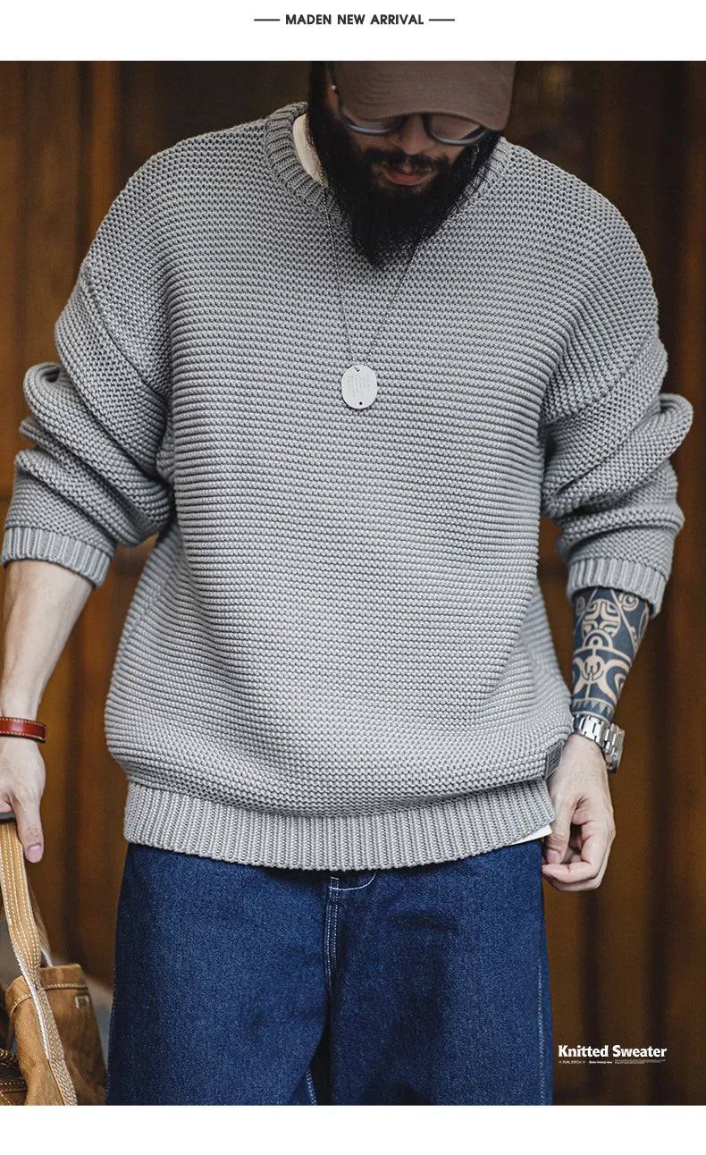 Maden Retro Heavyweight Knitted Sweater Loose Round Neck Pullover Warm Versatile Base Layer Knitwear for Men's Autumn and Winter