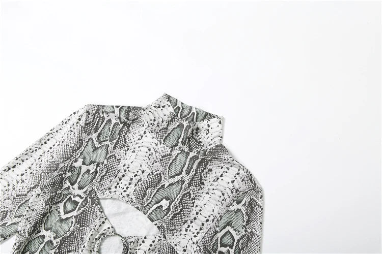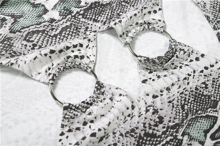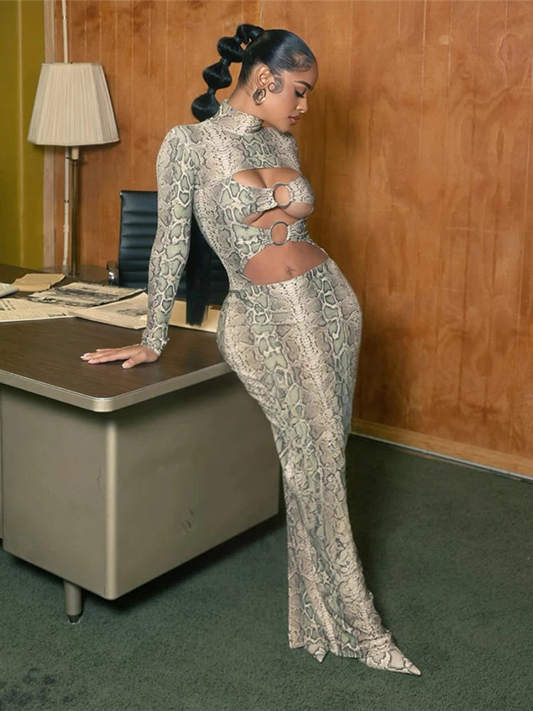 Nibber Hipster Maxi Dress Sexy Snakeskin Print Women Chest Hollow Metal Ring Turtleneck Peach Hip Street Stretch Skinny Vestidos