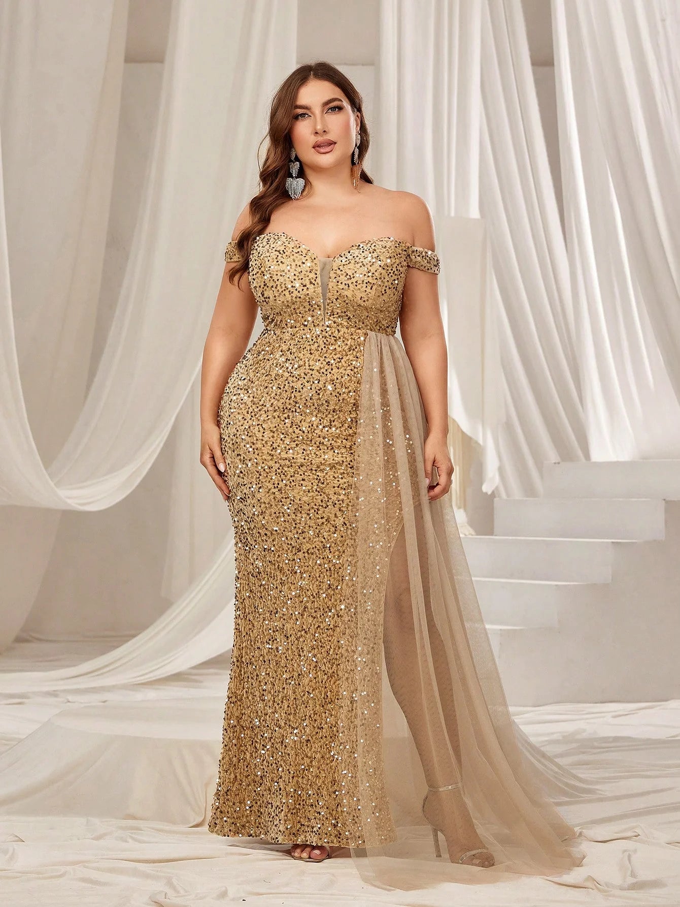 Plus Size Off Shoulder Contrast Mesh Draped Sequin Formal Dress