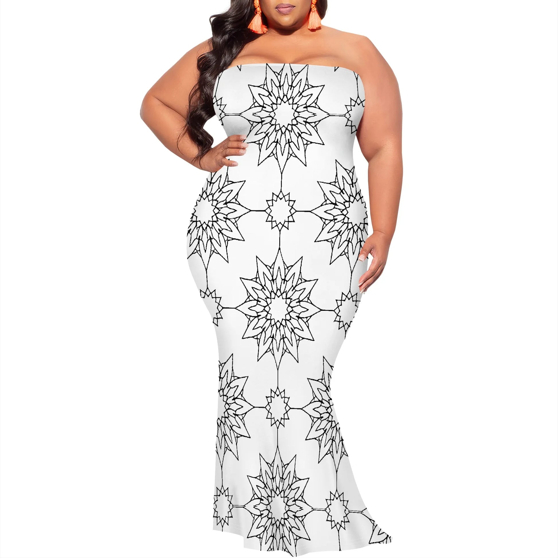 Plus Size Strapless Maxi Dress with Stylish Gold Geometric Design, Modern and Trendy