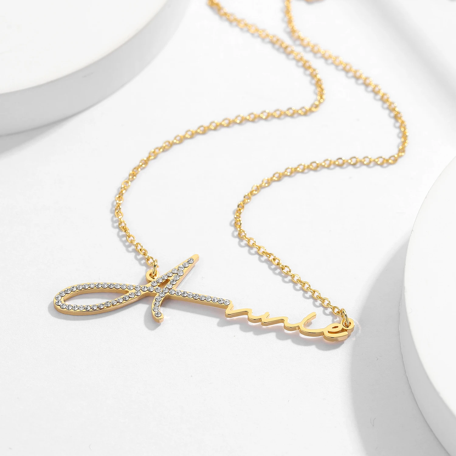 Qitian Personalized Signature Dainty Diamond Name Necklace Stainless Steel Handmade Custom Name Zircon Crystal Jewelry For Women