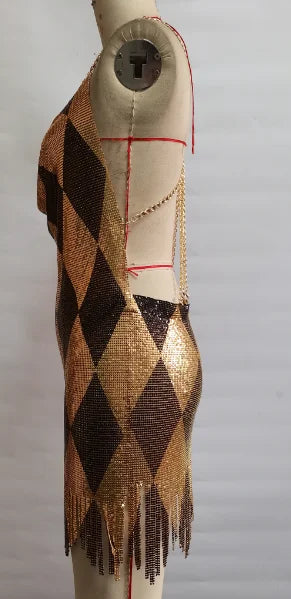 Sexy Backless Dresses For Woman Argyle Sequined Mini Dress Chain Strap Outwear V-Neck Sleeveless Summer Trendy Club Party Outfit