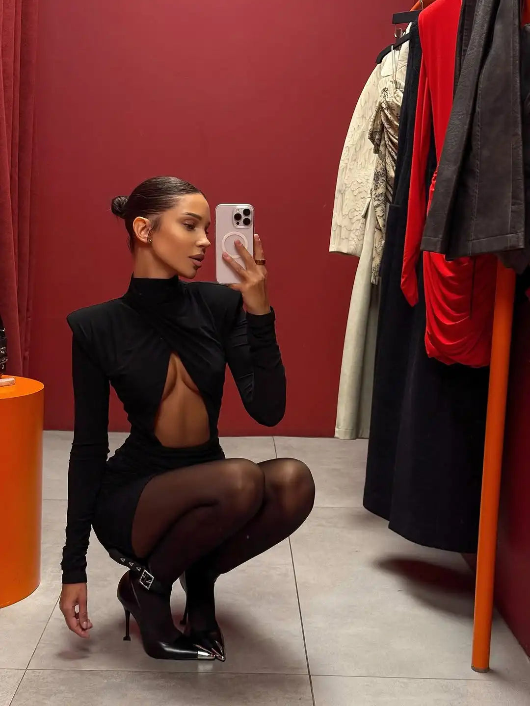 Sexy Hollow-out Pleated Mini Dress Women Fashion Solid Half High Collar Long Sleeve Slim Dresses 2025 Lady Party Club Robes