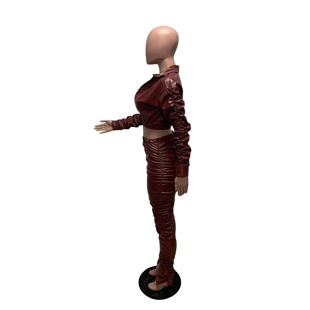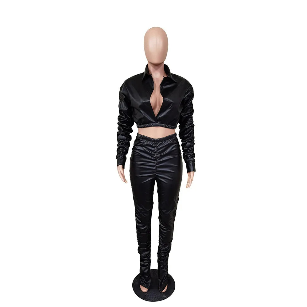 Sexy PU Faux Leather Two Piece Set for Women Birthday Night Club Outfits Crop Top and Slit Stacked Pants Matching Sets Undefined