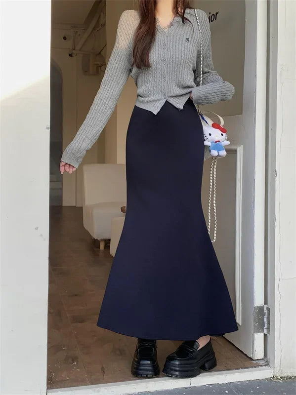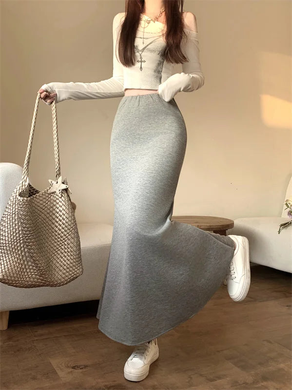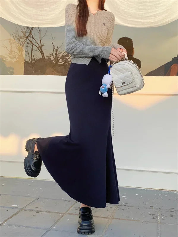 Solid Vintage Temperament Package Hip Skirts Elastic High Waist Simple Spring Autumn 2026 Fish Tail Skirt Casual Slim Long Skirt