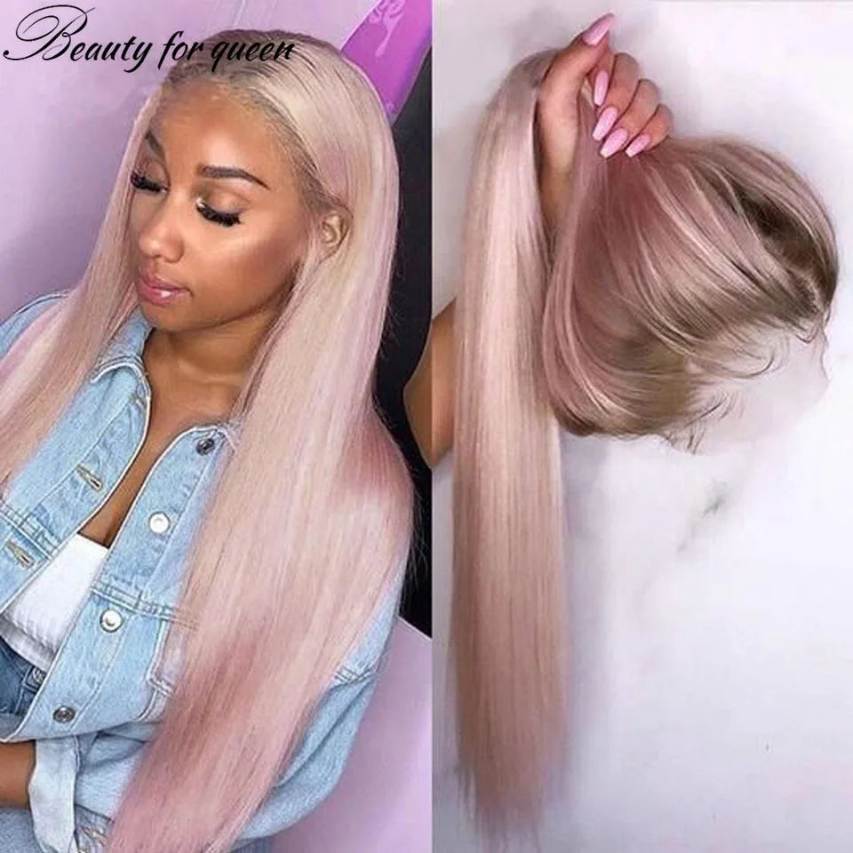 Straight Pink With Dark Roots Wigs Lace Front Human Hair Wigs For Women Transparent Lace Frontal Wigs Brazilian Hair Pre Plucked