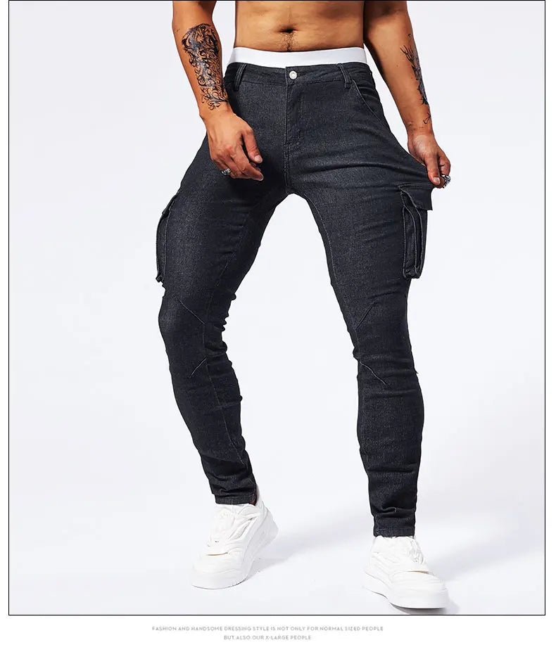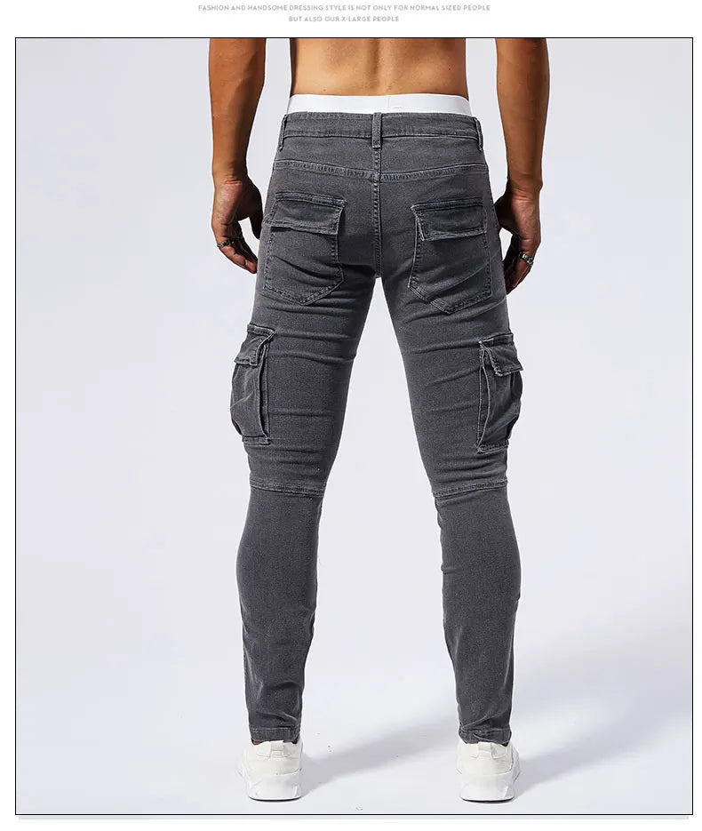 Street Elastic Jeans Men Denim Cargo Pants Wash Solid Color Multi Pockets Casual Mid Waist Trousers Slim Fit Daily Wear Joggers