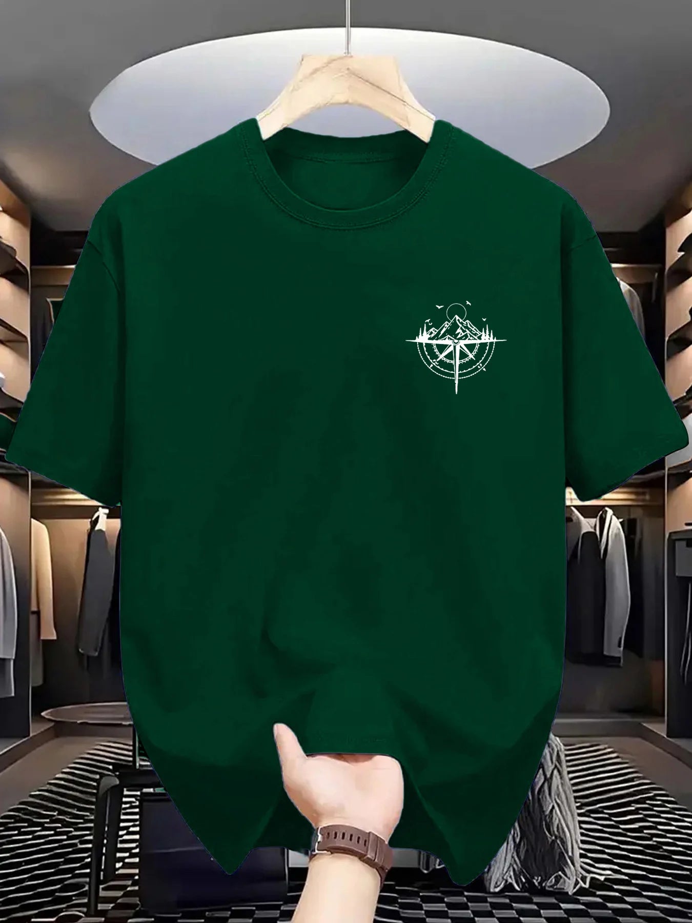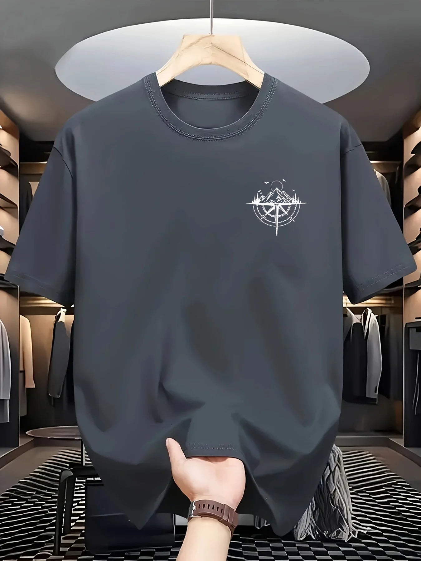 Summer Men's 100% Cotton Mountain Compass Graphic Printed Casual Loose Sports Comfortable Round Neck Short Sleeve T-shirt Top