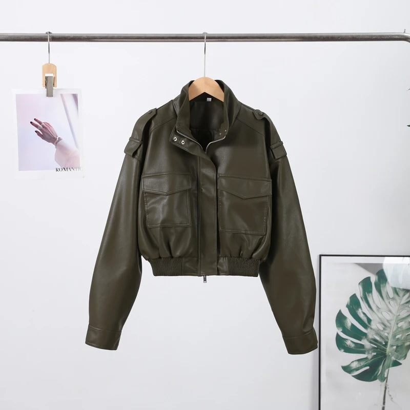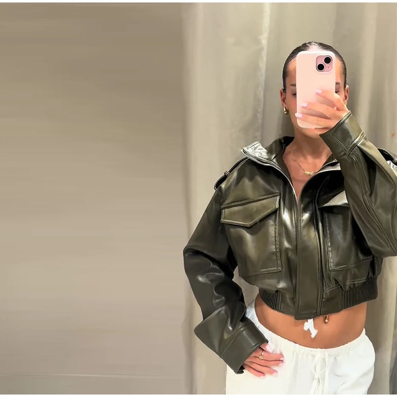 Vintage Zippers Short Leather Jackets Women's Casual Lapel Button Pockets Full Sleeve Coat 2025 Autumn New Lady Chic Streetwear