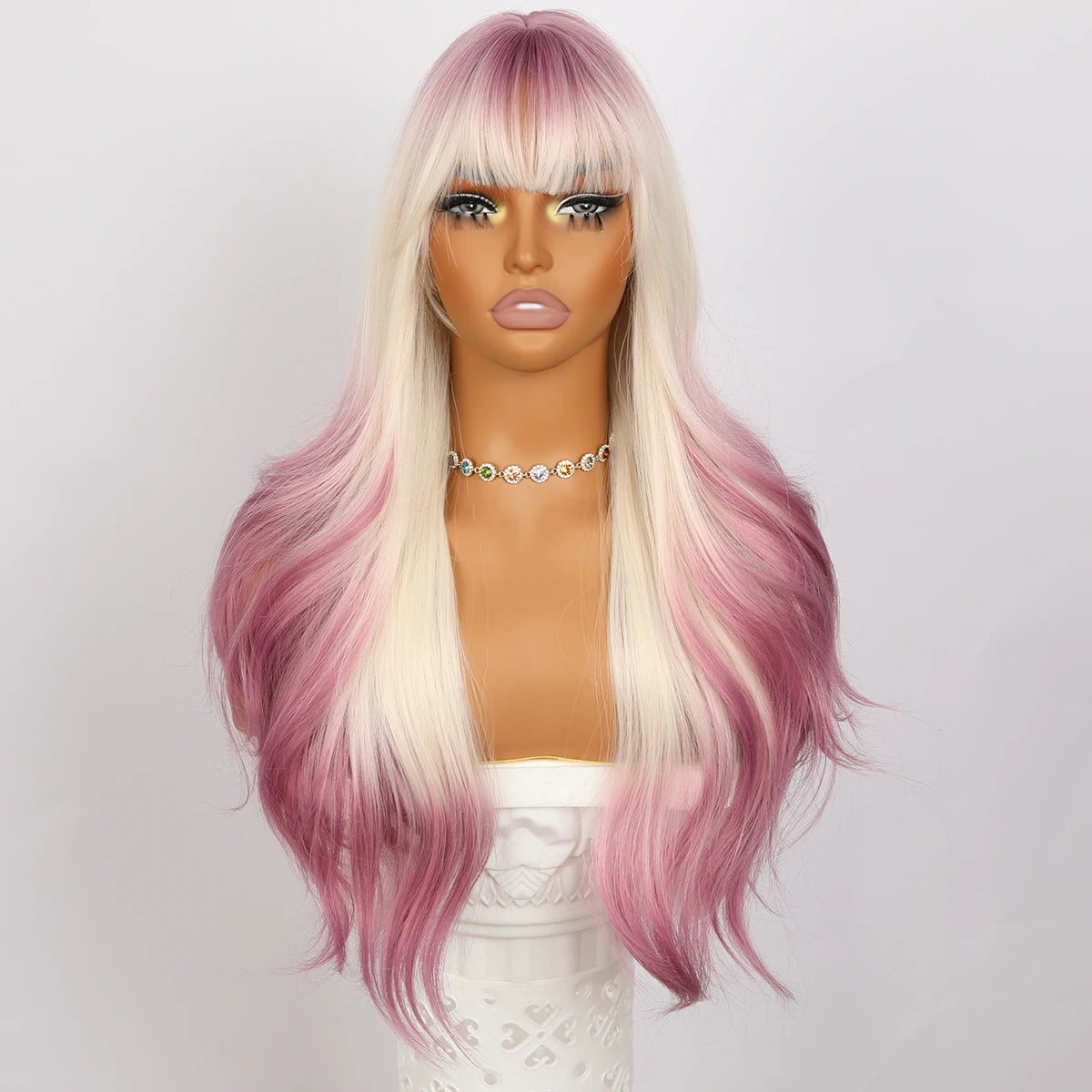 Wholesale New Ladies' Long Curly Pink Wig with Bangs Gradient Gold Body Wave Headdress Manufactured by SM393