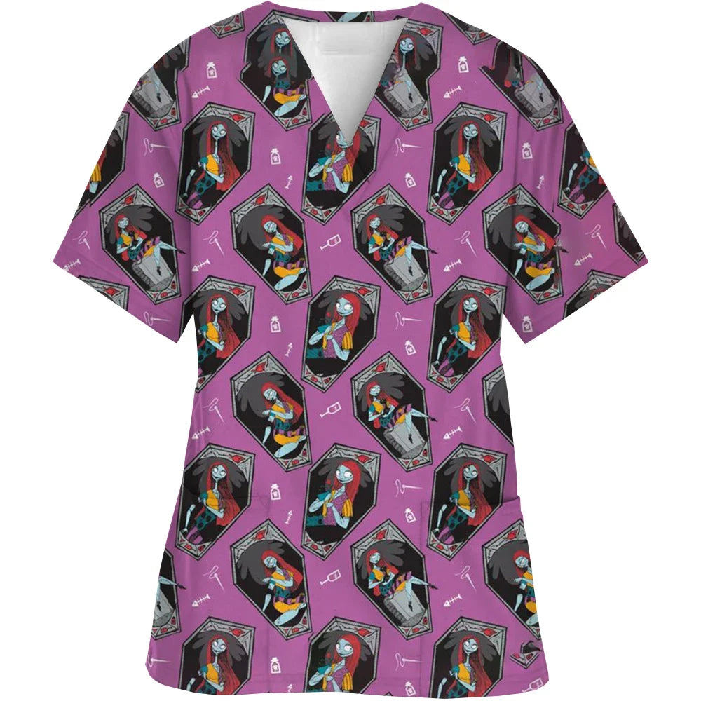 Women Short-Sleeved V-Neck Nurse Top Halloween Women's Fashion Casual Printing Top Protective Work Suit Medical Working Uniform