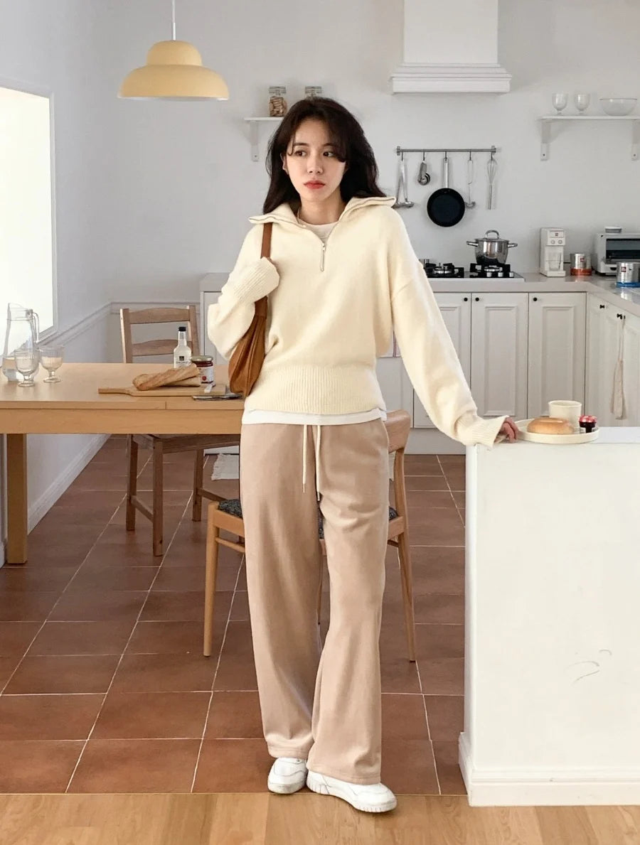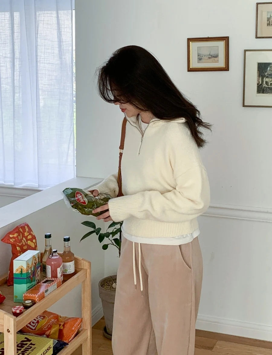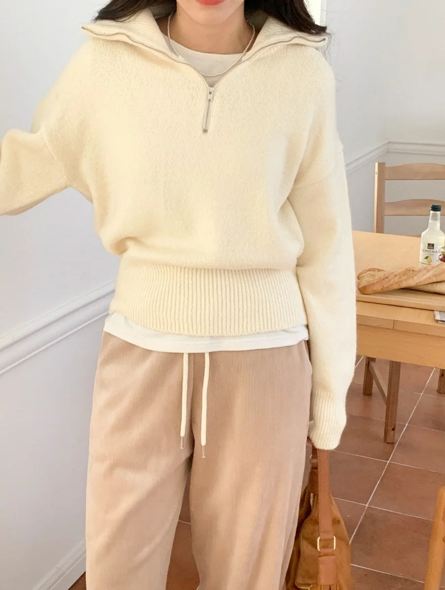 Women's Casual Loose Knitted Sweater Autumn Winter Chic Design Versatile f Zipper Stand Collar Color Top