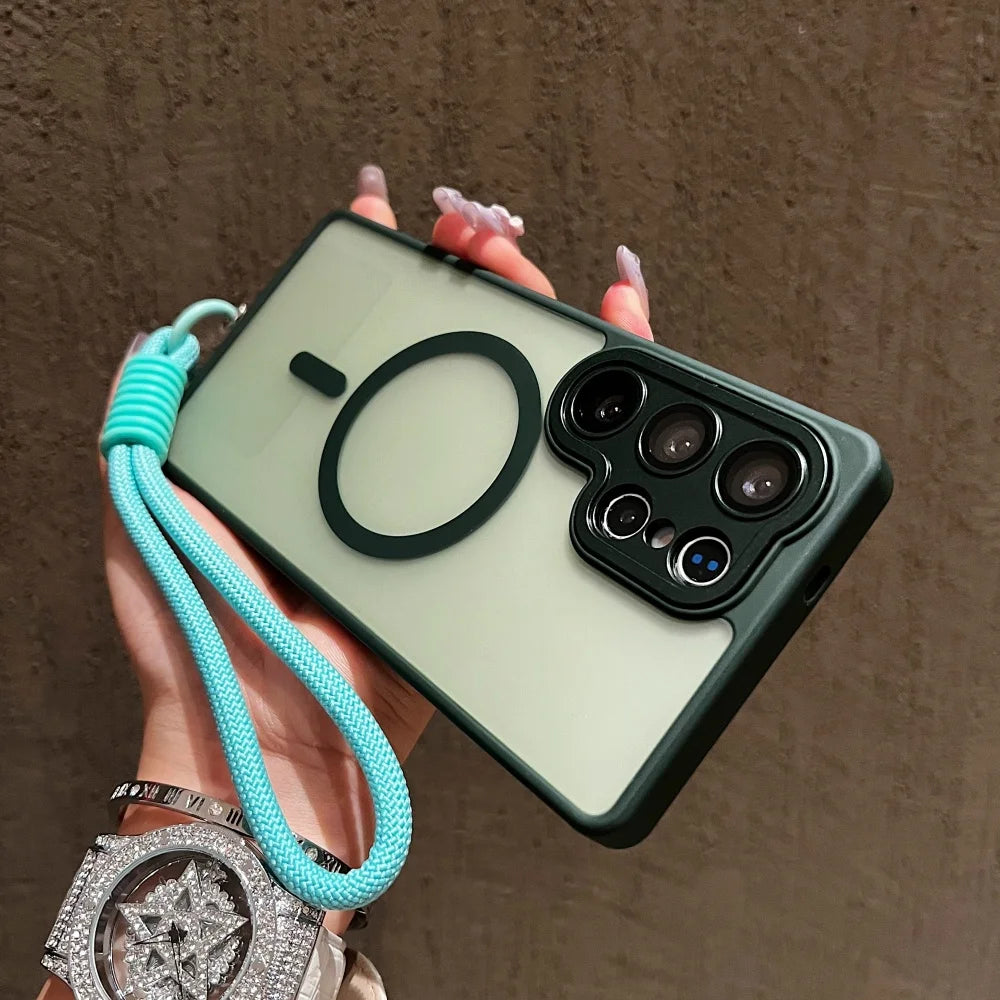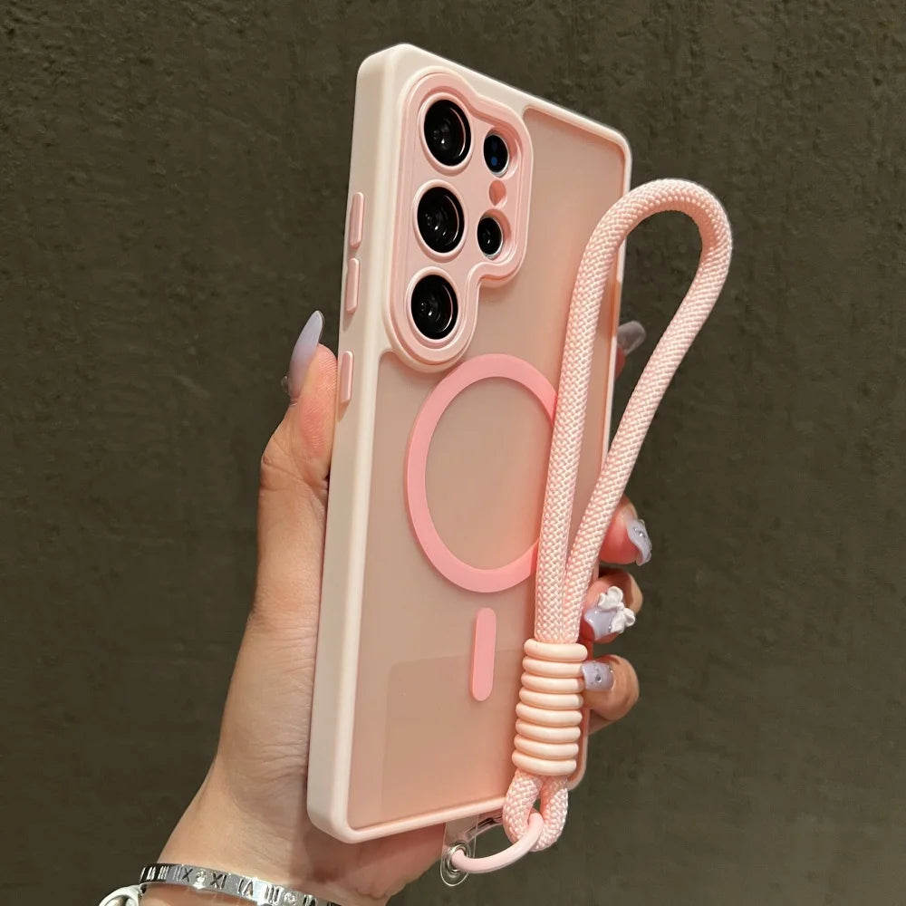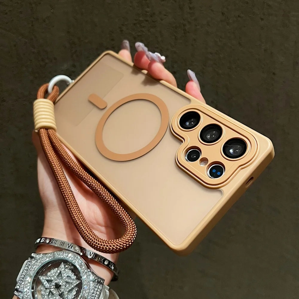 Wrist Strap Cord Magnetic Matte Translucent Armor Case For Samsung S25 Ultra S24 FE S23 Plus For Magsafe Wireless Charge Cover
