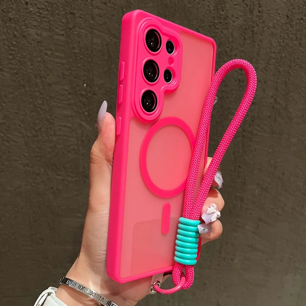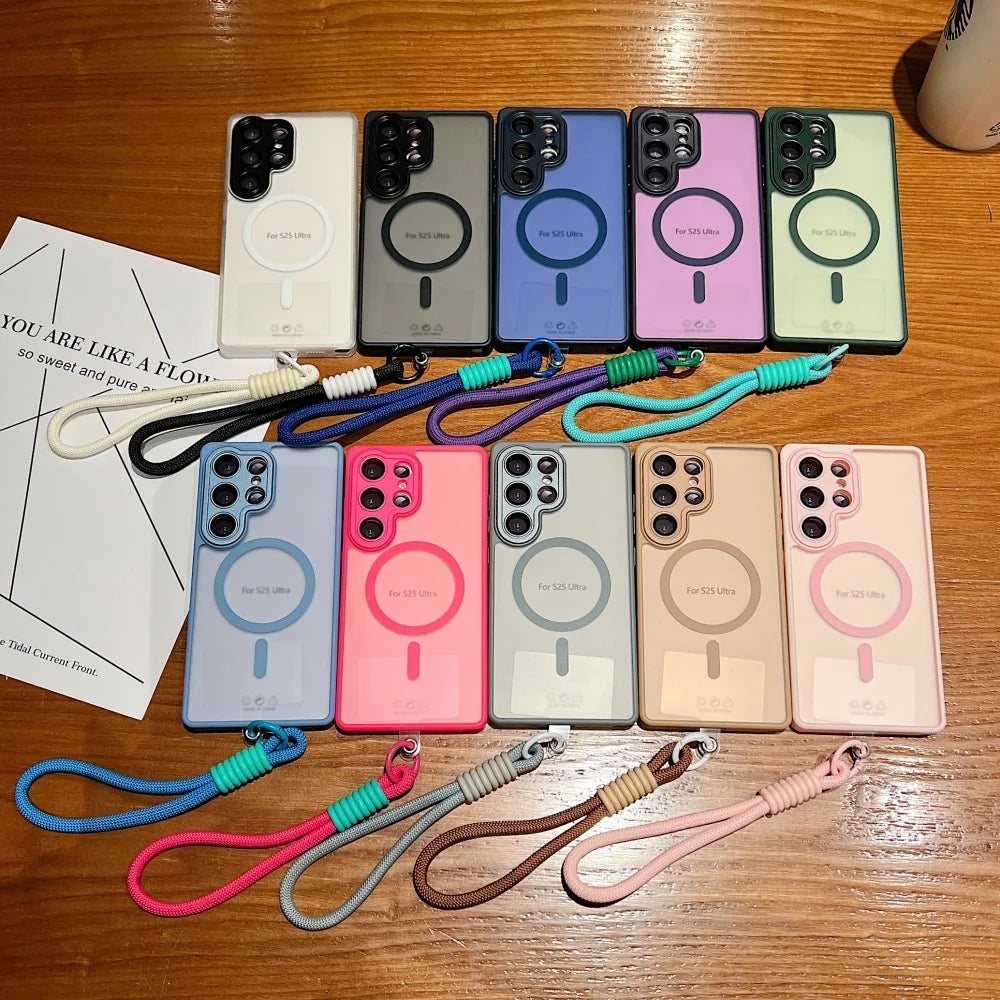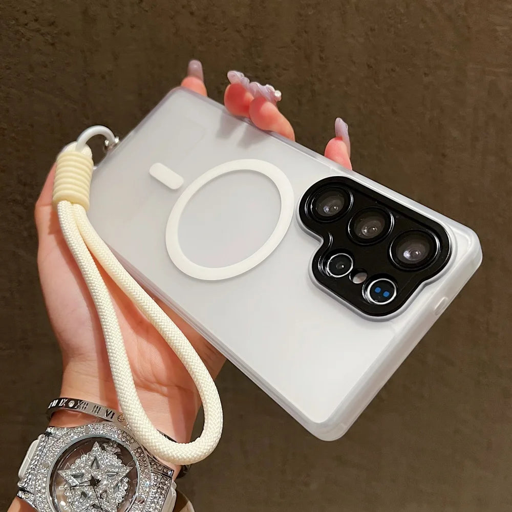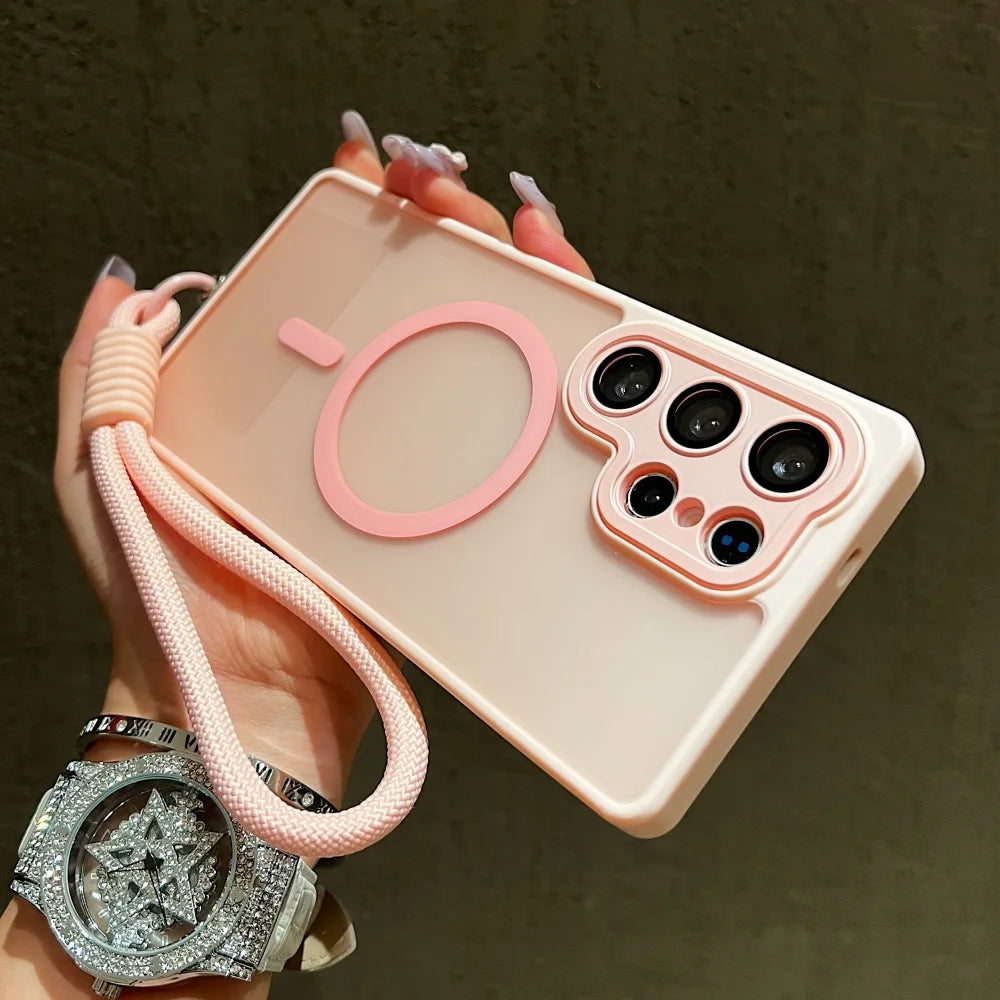 Wrist Strap Cord Magnetic Matte Translucent Armor Case For Samsung S25 Ultra S24 FE S23 Plus For Magsafe Wireless Charge Cover