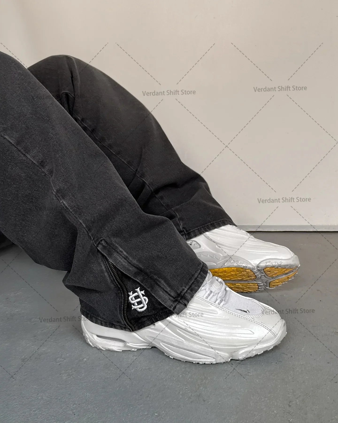 Y2K Cuffed Zipper Embroidered Wide-Leg Jeans Street Gothic Hip-Hop Loose-Fit Fashionable Men's Jeans Trendy Versatile Denim Pant